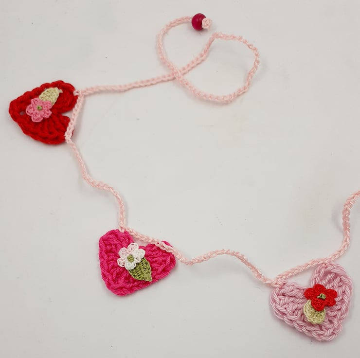 There are twelve hearts , four in each colour. Each one is embelleshed with a tiny crochet flower and leaf. The whole garland measures approximately 150 cm long. A gift tag with wording of your choice can included in the box.