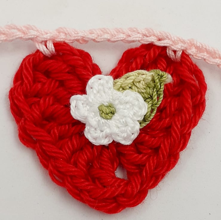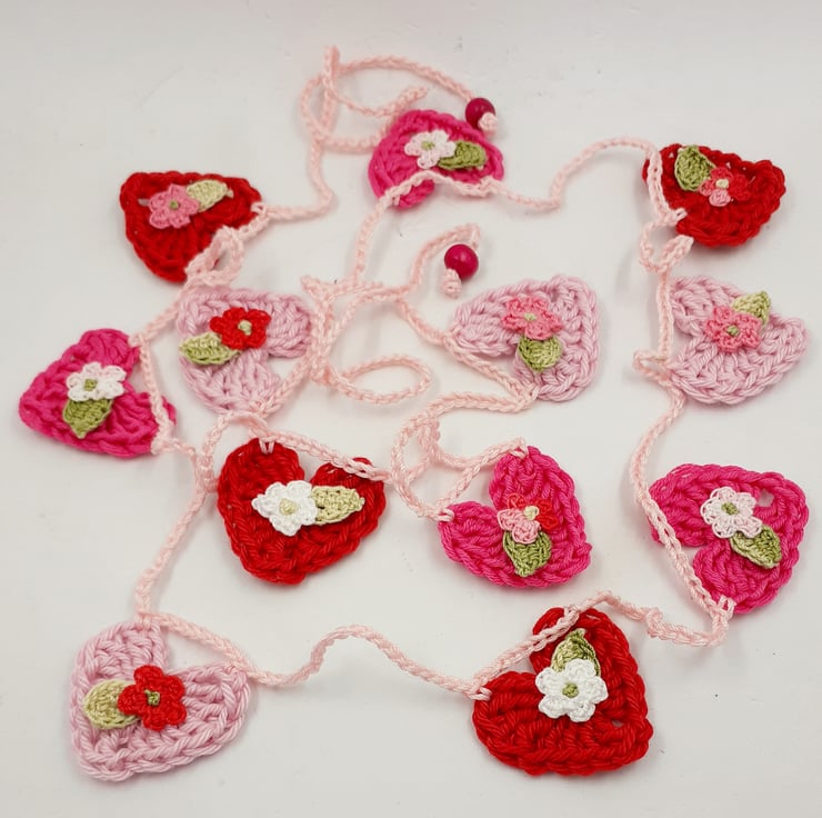 There are twelve hearts , four in each colour. Each one is embelleshed with a tiny crochet flower and leaf. The whole garland measures approximately 150 cm long. A gift tag with wording of your choice can included in the box.
