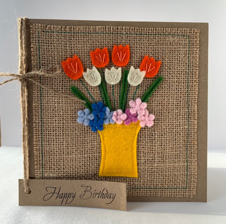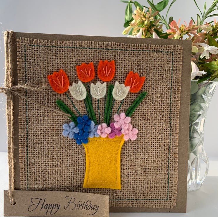 This handmade Birthday card is decorated with a bright yellow vase of orange, cream, blue and pink flowers. The decoration is hand cut from 100%wool felt. It is then sewn by hand and machine onto a hessian background.