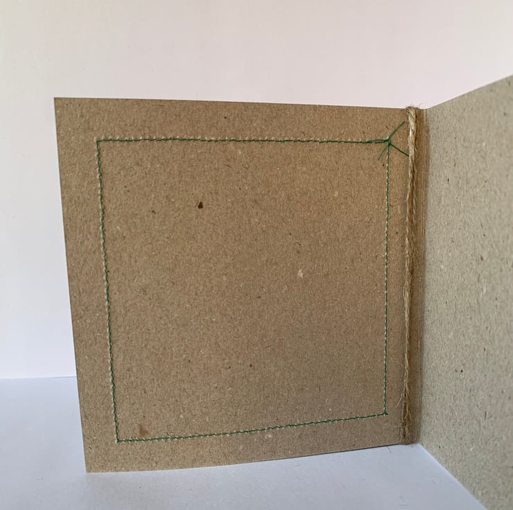 The hessian is machine stitched, using a contrasting thread, onto a plain brown recycled card. This stitching is visible on the inside of the card.