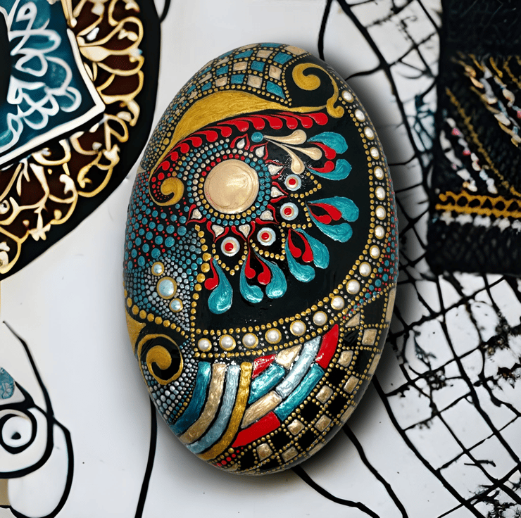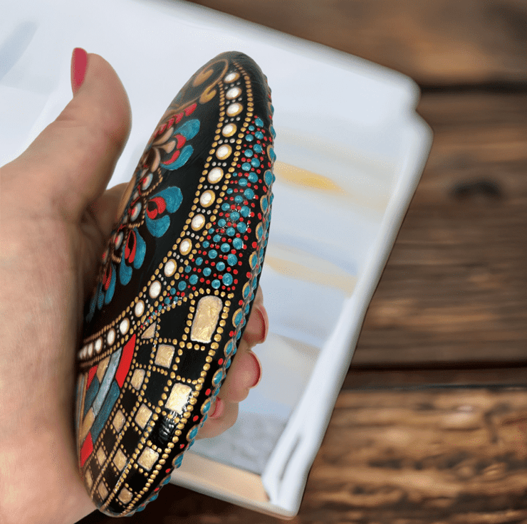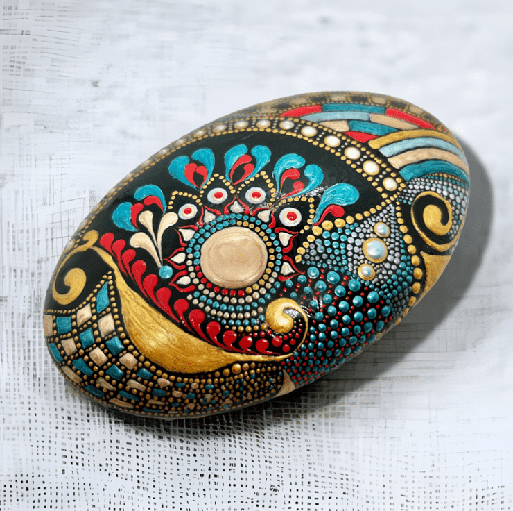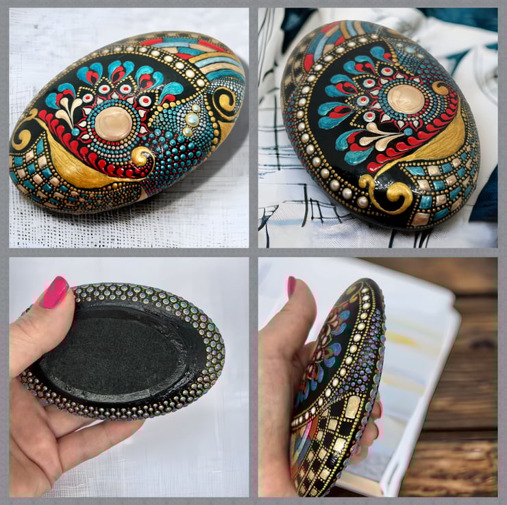 The base is padded to protect any delicate surface it may be placed upon. The whole piece has been coated first in a layer of resin and then painted freestyle and finally topped with a satin varnish.