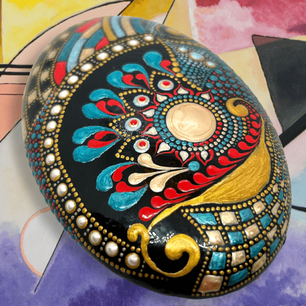 This was painted by me, totally intuitively and without much formal planning. As in a deconstructed mandala where the individual motifs become jumbled and dreamlike so it began to take shape in it’s own way.