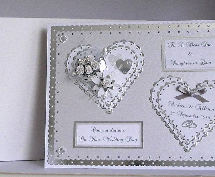 The card is embellished with two scalloped hearts and made in white/ivory pearl and silver colours