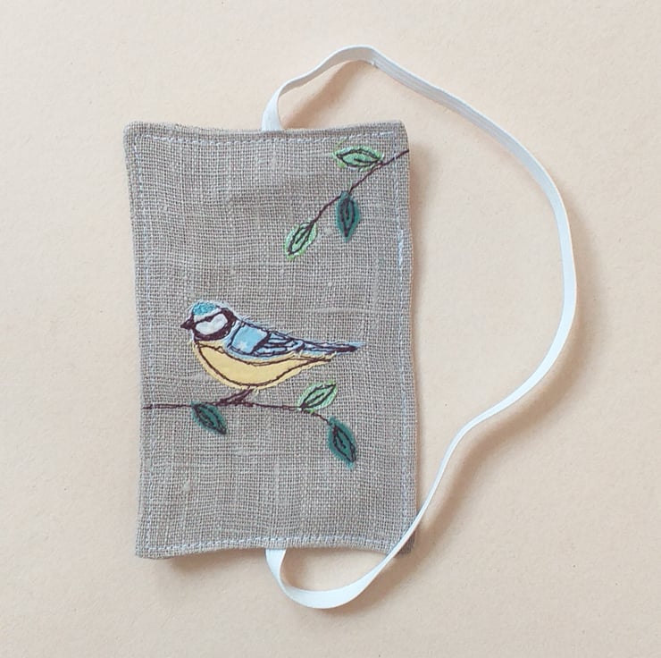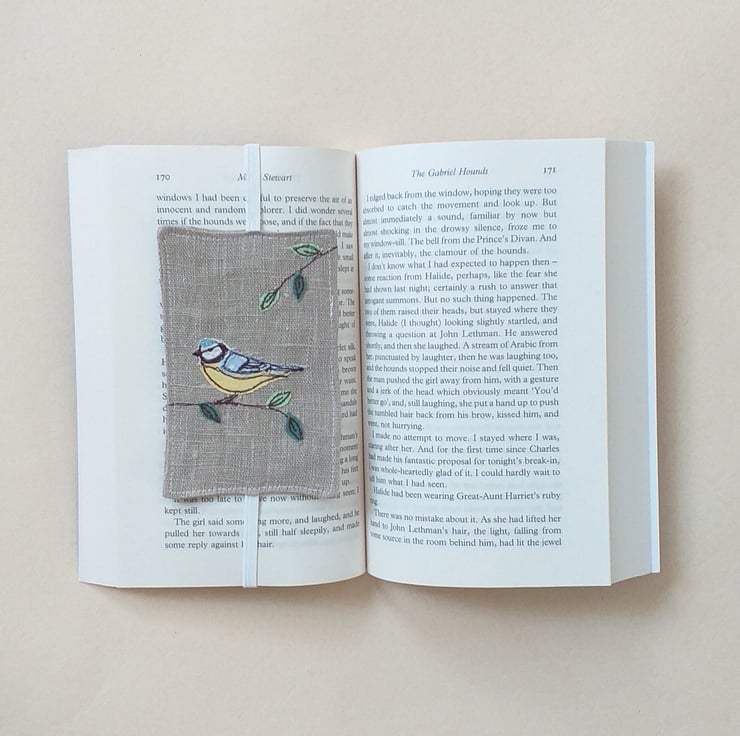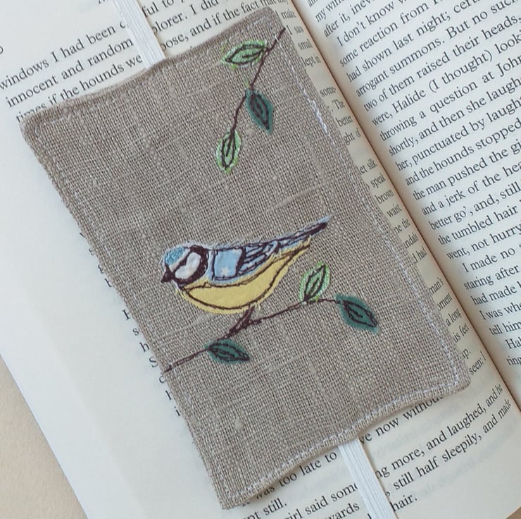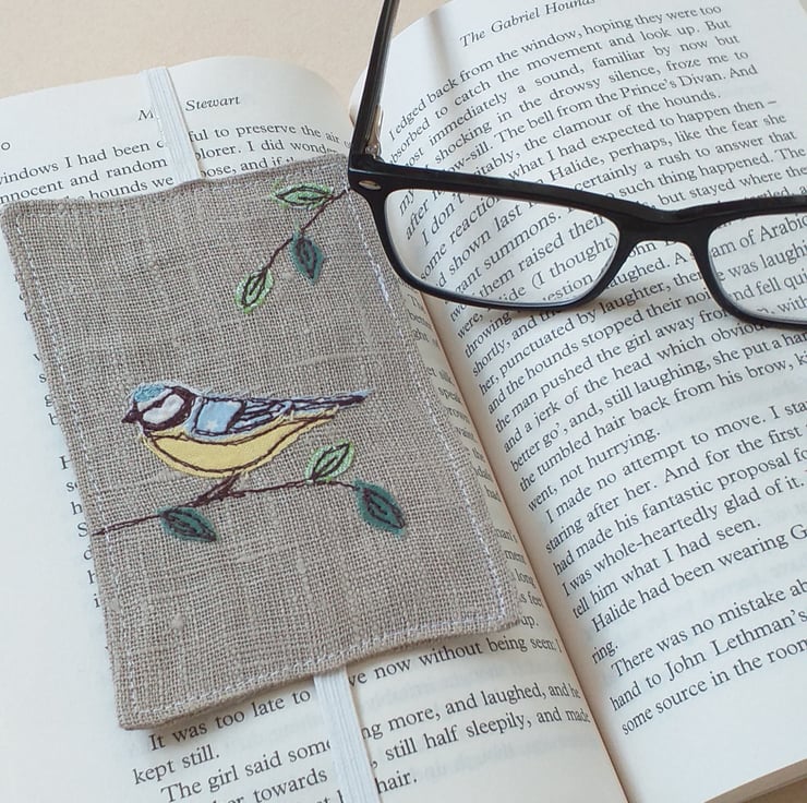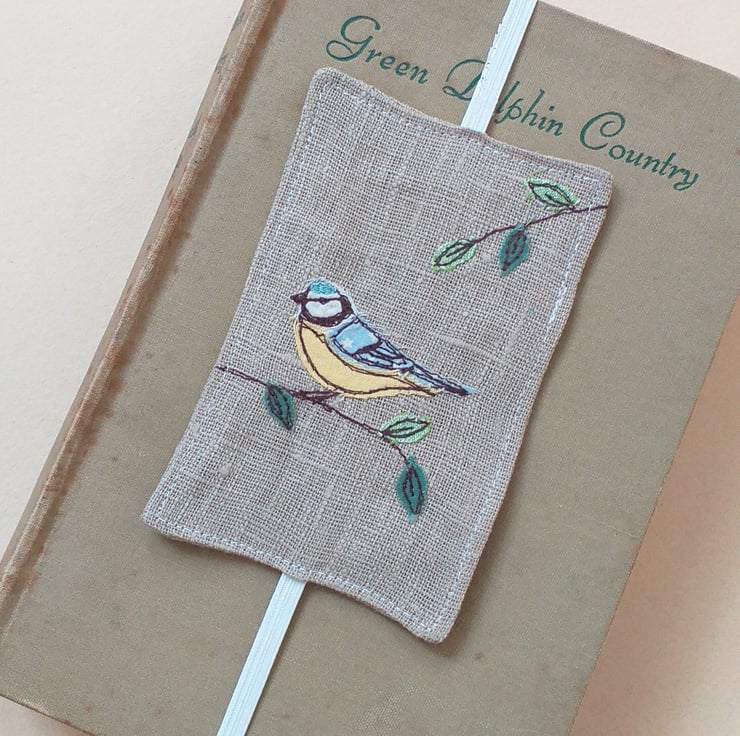 A really practical bookmark made from linen with an elastic band to go round your book and keep the page. It has an embroidered blue tit with leafy branches made from free motion embroidery over applique.