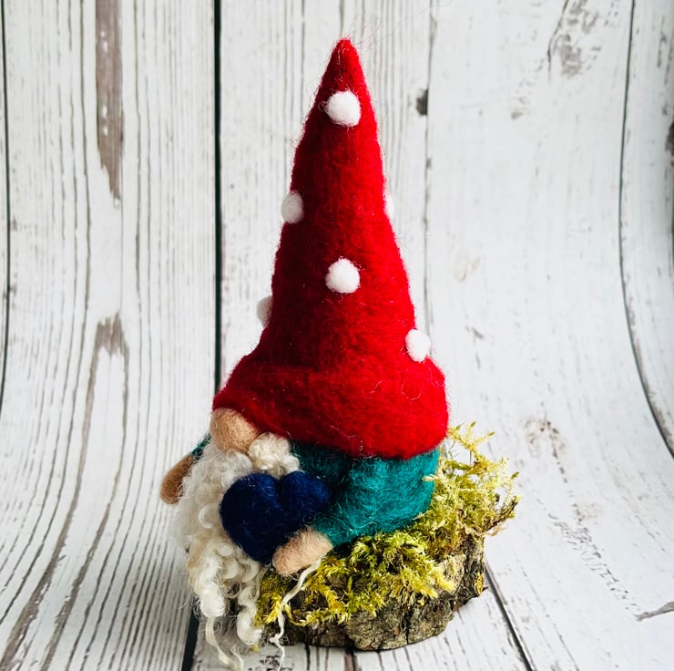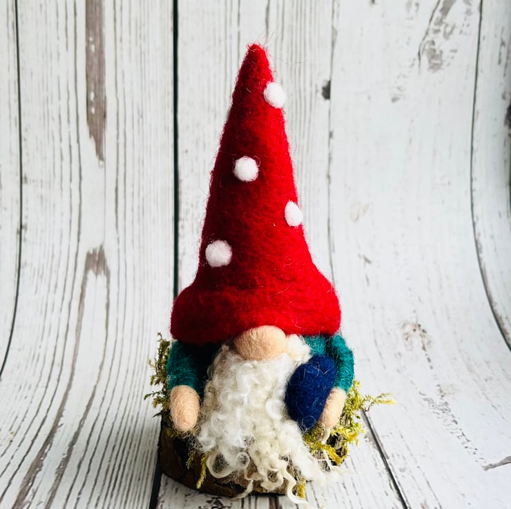 Needle Felted Toadstool Gonk / Gnome with a small blue heart.