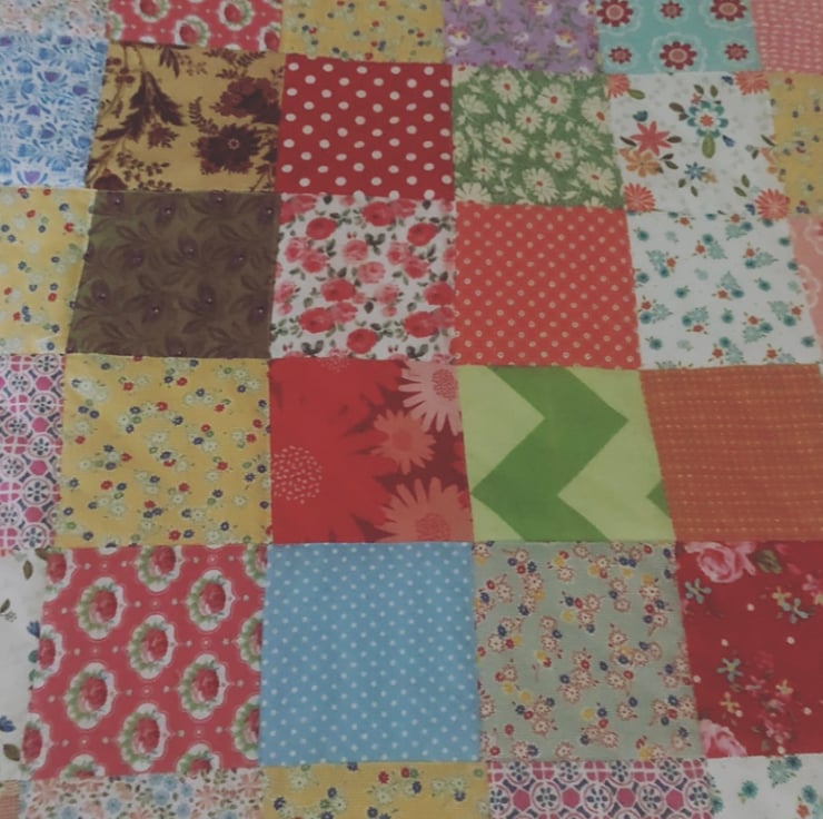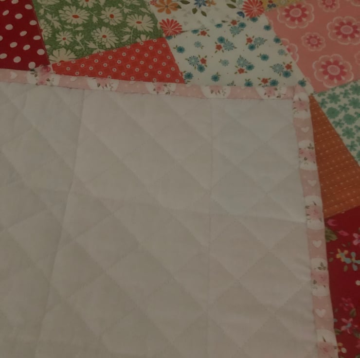 Gorgeous patchwork quilt measuring 43 inches x 39 inches. It is hand made with cotton fabrics, quilted and backed with a white cotton fabric.