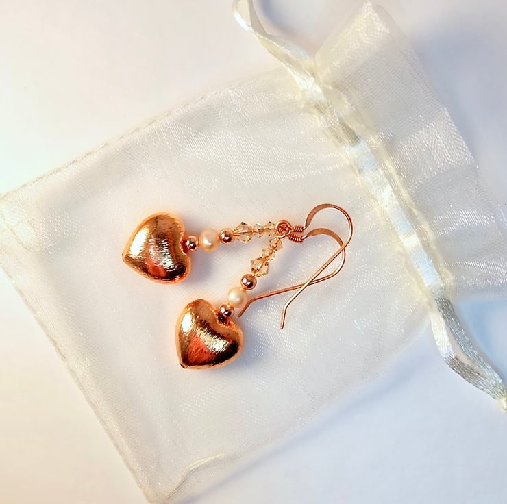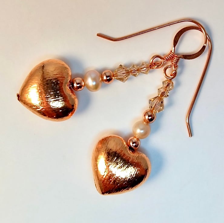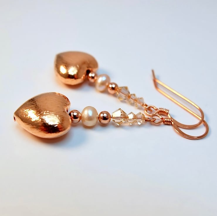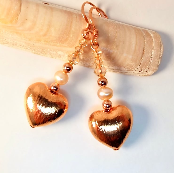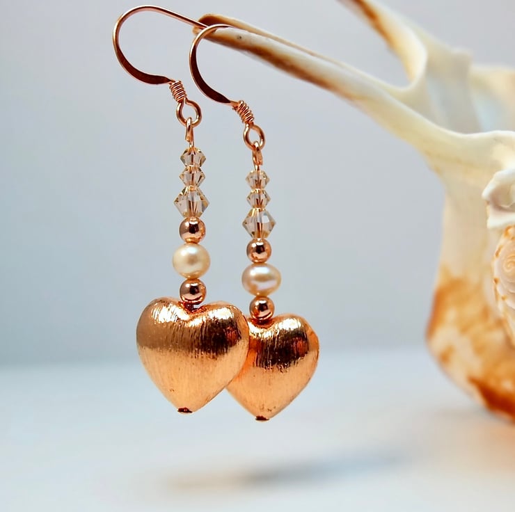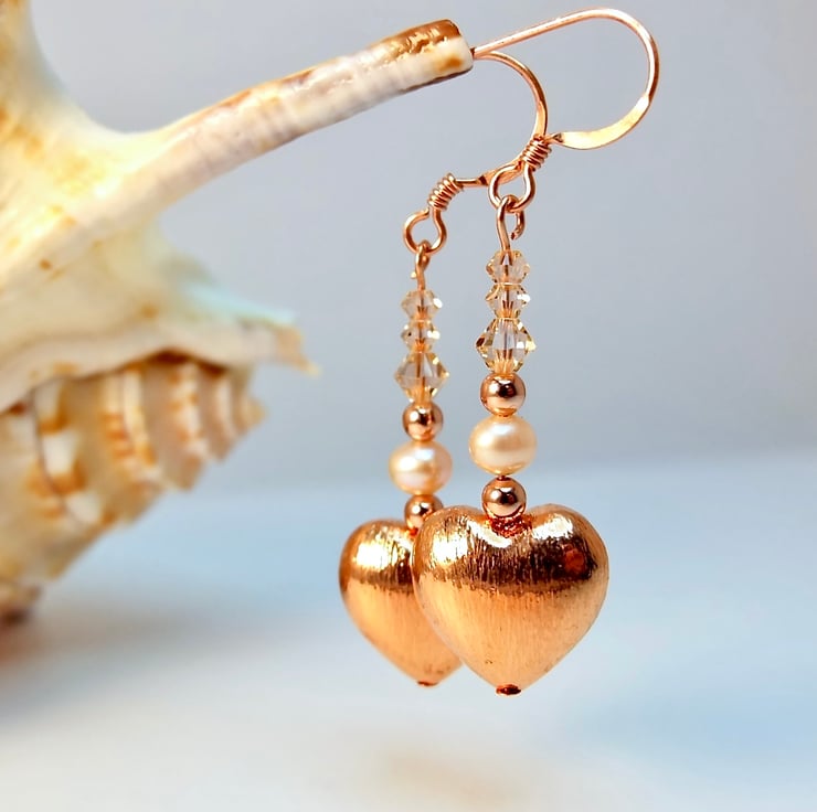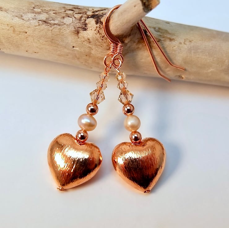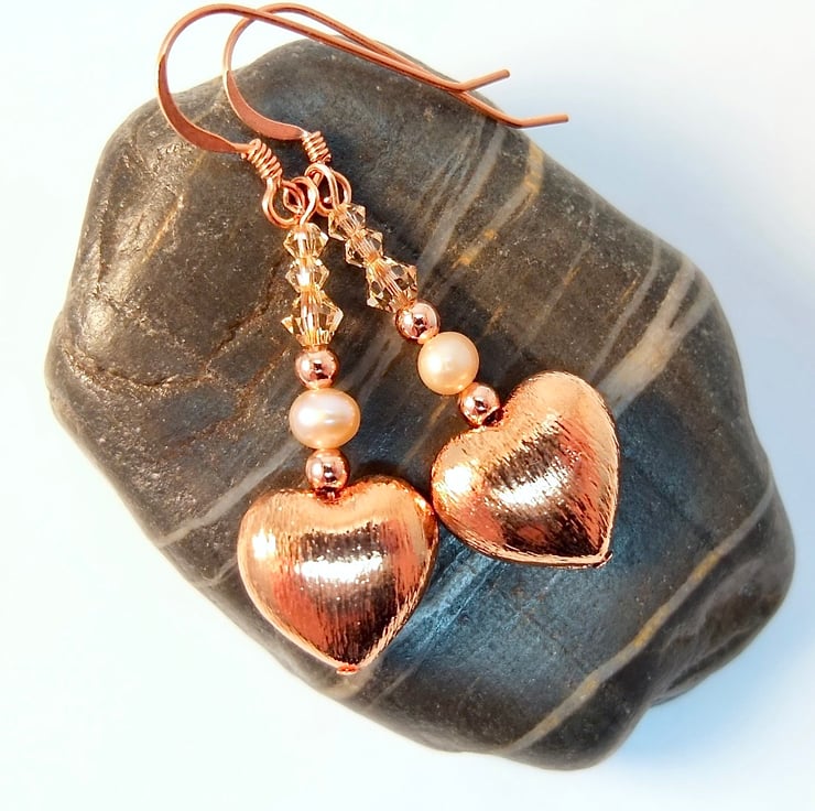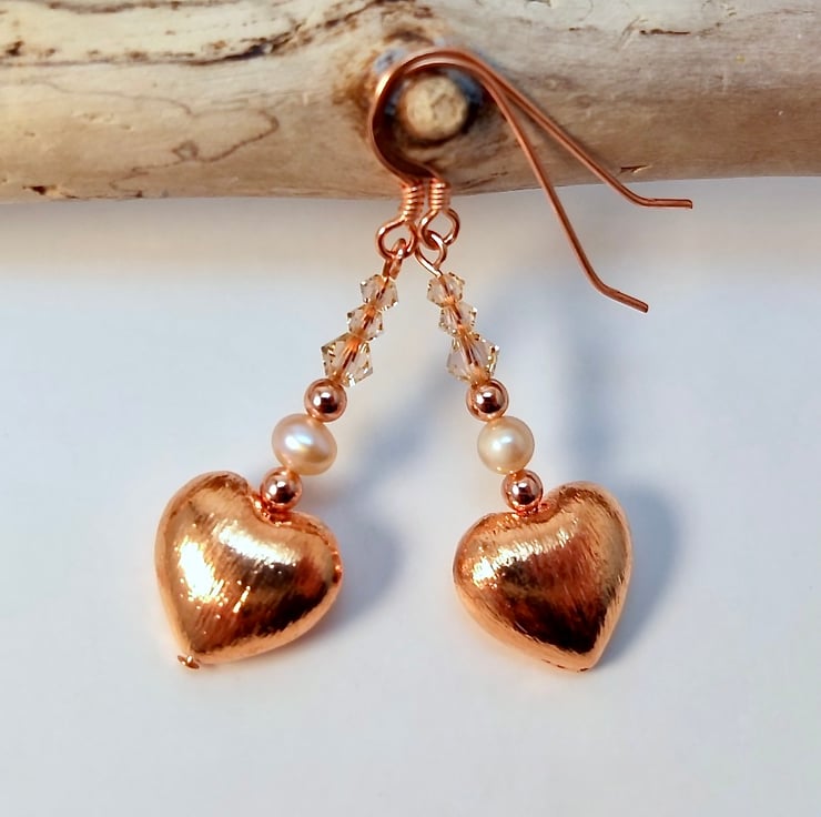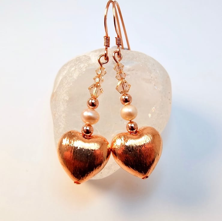 Sparkly earrings featuring a 14mm pure copper heart with a brushed effect, topped with a freshwater, pale peach Pearl set between a pair of 3mm copper beads, and a trio of Swarovski crystals, one 4mm and two 3mm, in the colour 'light peach'.