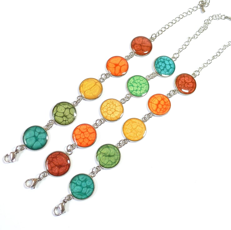 Rainbow bracelet made of stainless steel bezels connected with stainless steel chain. Each bezel is filled with a bright coloured red, orange, yellow, green or turquoise enamel and topped with a layer of epoxy resin to seal it. Matches with other items in my Rainbow Collection. A colourful and easy-to-wear piece of jewellery.