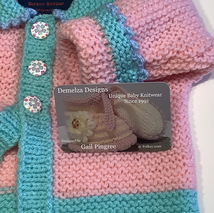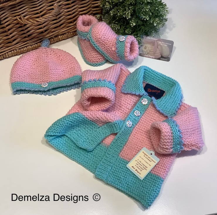 The set has been totally hand crafted using quality branded premium machine washable yarns and designed by Demelza Designs whom have years of experience for creating unique baby knitwear. The buttons are made from genuine wood with a dainty floral design on them. On the back neck edge of the jacket/cardigan is the luxery garment tag (manufactured in Cornwall) with the care instructions woven on the reverse for lasting reference. Hand crocheted picot edges provide a feminine touch. A quality card garment swing tag will also be attached to the front of the garment as proof of it's origins if gifting providing a total professional touch.