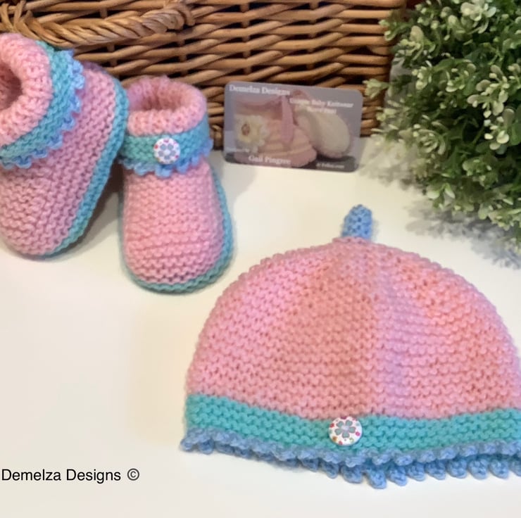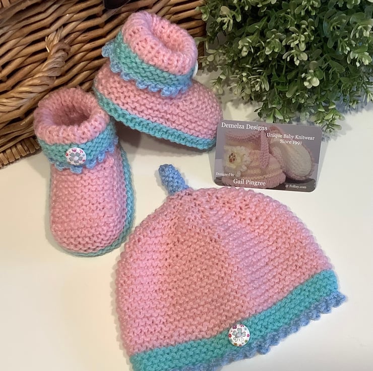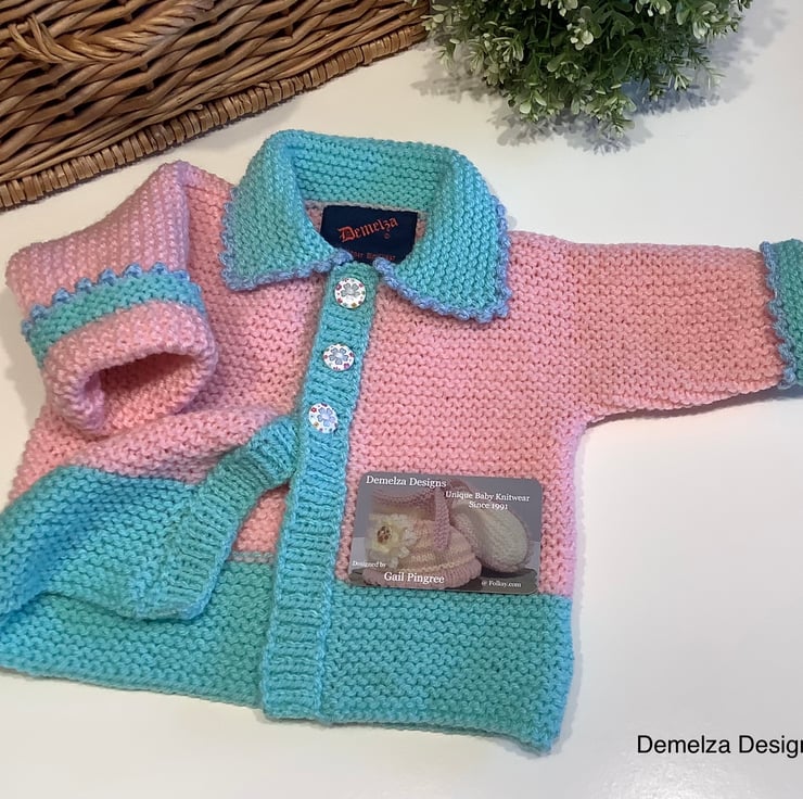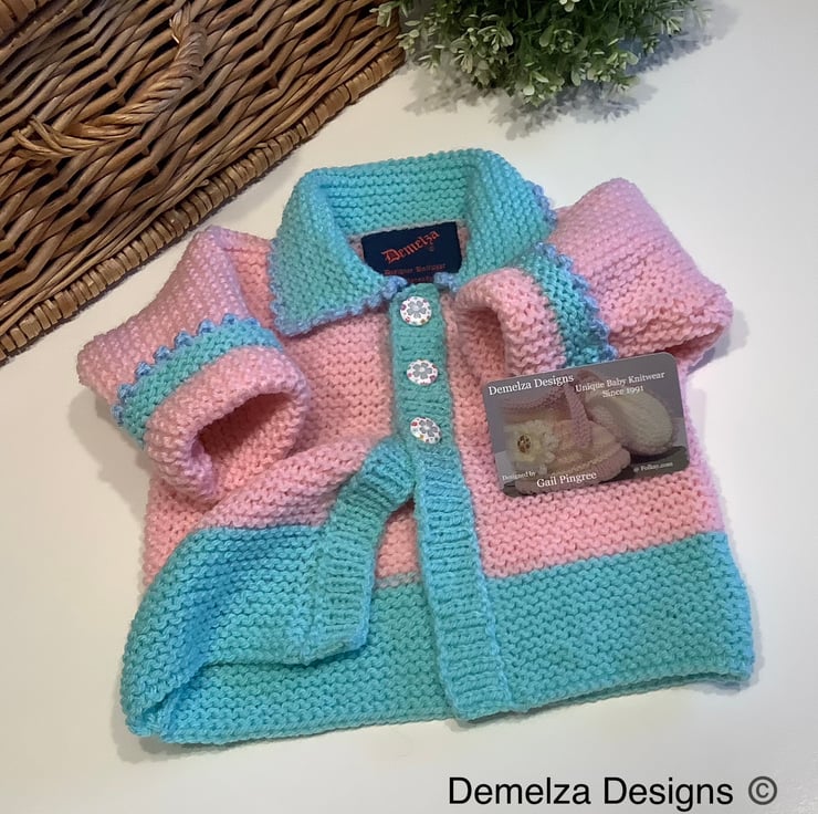 The set has been totally hand crafted using quality branded premium machine washable yarns and designed by Demelza Designs whom have years of experience for creating unique baby knitwear. The buttons are made from genuine wood with a dainty floral design on them. On the back neck edge of the jacket/cardigan is the luxery garment tag (manufactured in Cornwall) with the care instructions woven on the reverse for lasting reference. Hand crocheted picot edges provide a feminine touch. A quality card garment swing tag will also be attached to the front of the garment as proof of it's origins if gifting providing a total professional touch.
