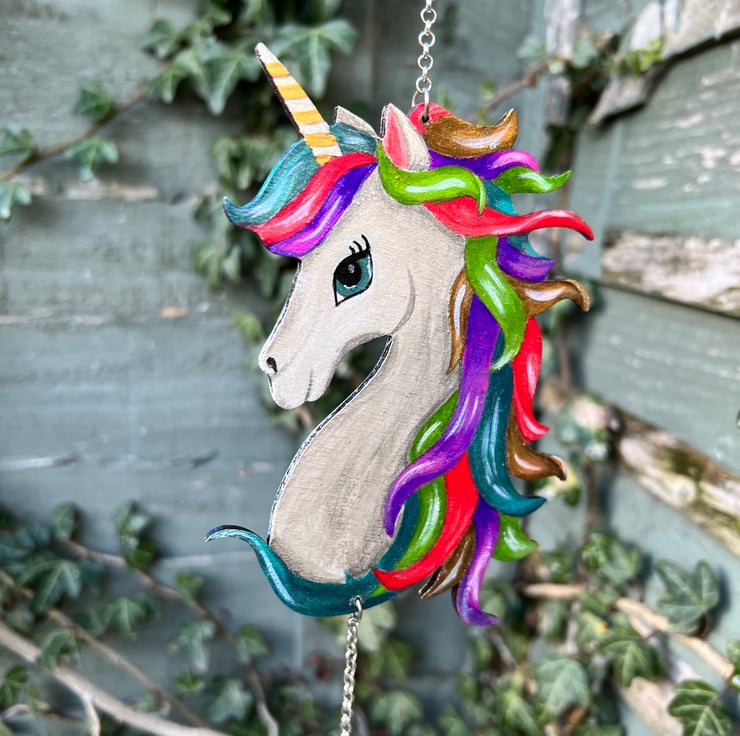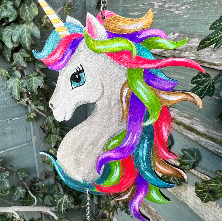Wooden unicorn windchime. Laser cut and hand painted with metallic acrylic paint. Stainless steel hanging chain, aluminium chimes for a gentle sound. Lacquered so is suitable for indoor and outdoor use.