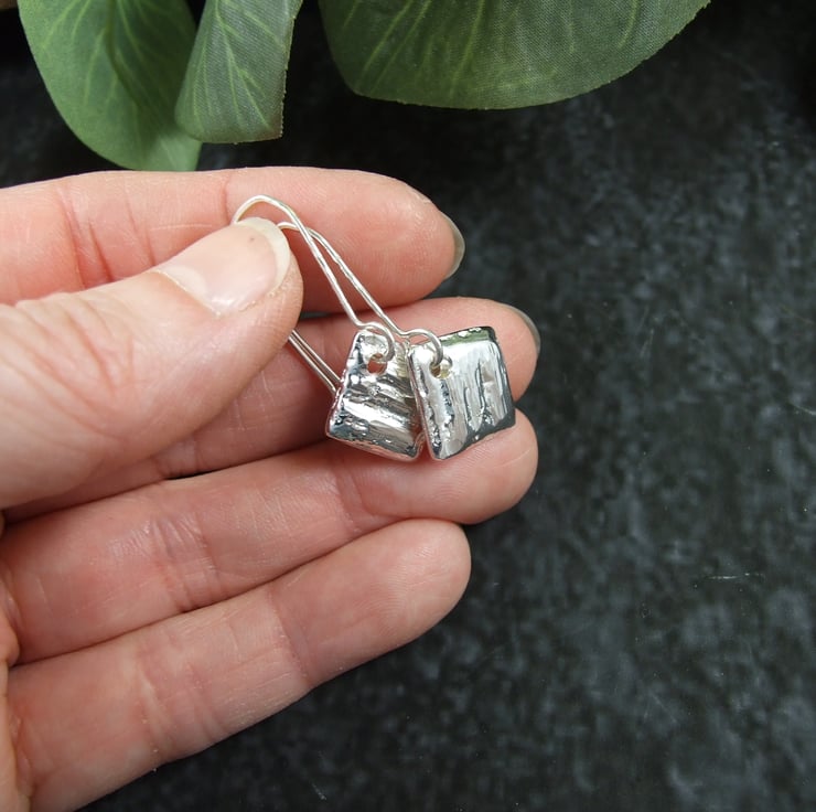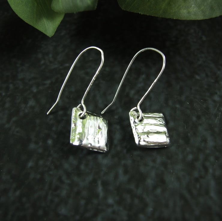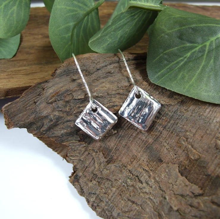 Sterling Silver Square Earrings. Recycled hand cast Textured dropper earrings.