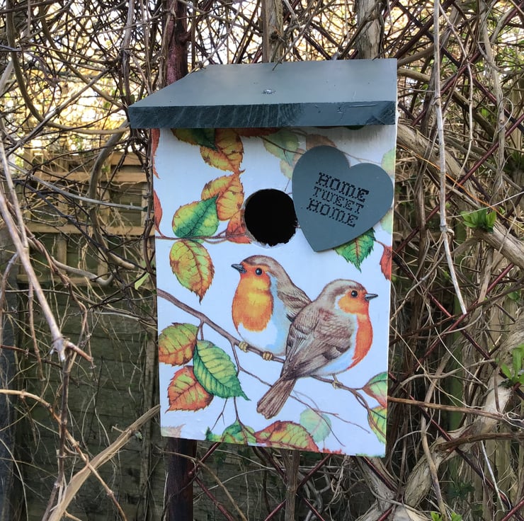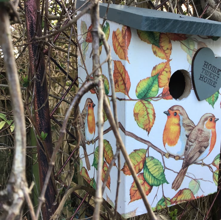 This wood bird box has been hand painted and decoupaged, varnished with several coats. Heart decoration.