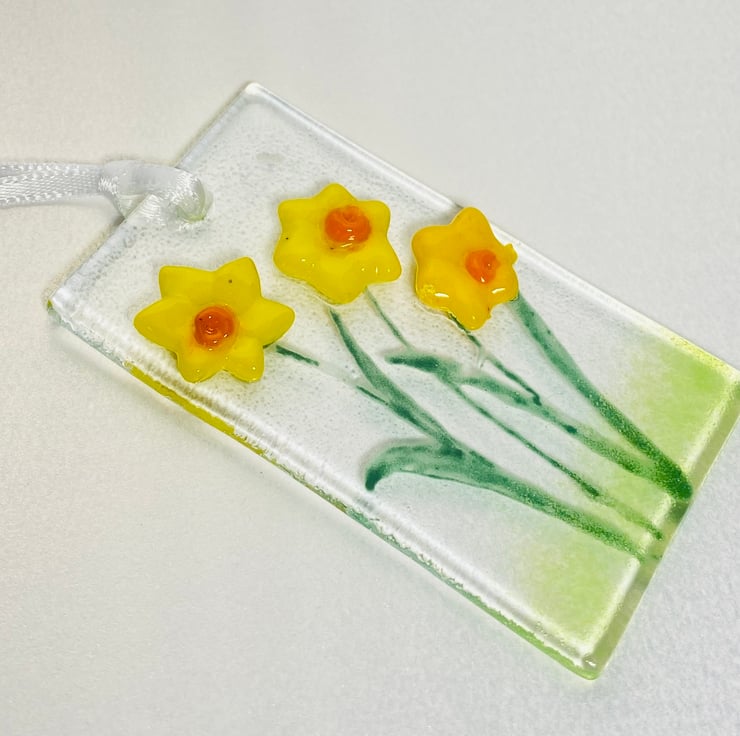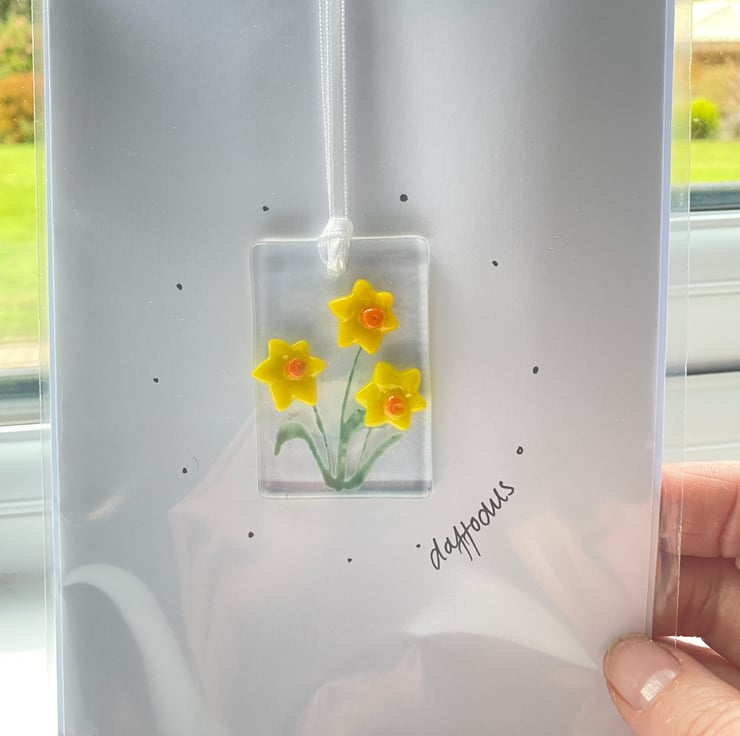Fused glass daffodil hanging keepsake on this card for any occassion. Give the recipient something to cherish . There’s pretty fused glass daffodil hangings can be hung anywhere in the home and I’ve had customers wear them as necklaces .
