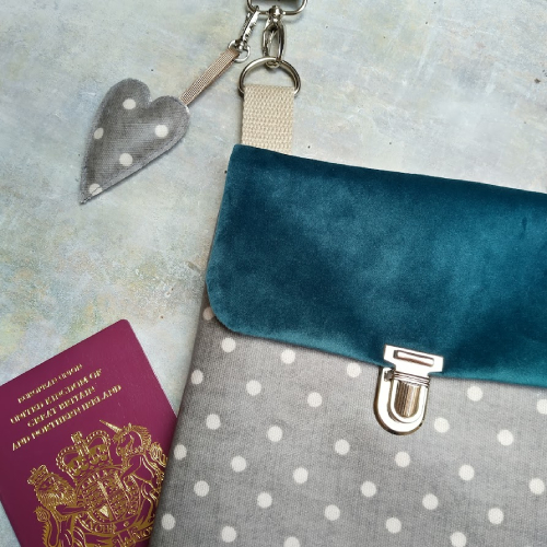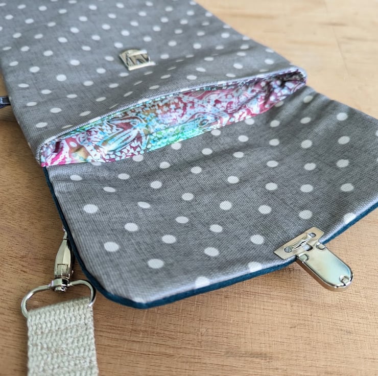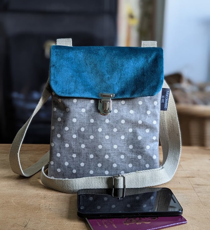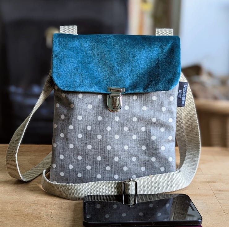 Handmade using a matt grey polka dot PVC coated cotton (oilcloth), with a deep teal coloured velvet flap, a batik patterned cotton lining complements the colours of the bag.