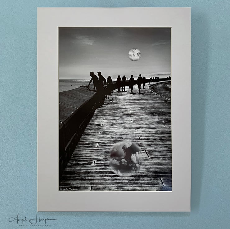A large fine art monochrome photograph of people strolling in Scarborough early one morning. With fantasy moons.