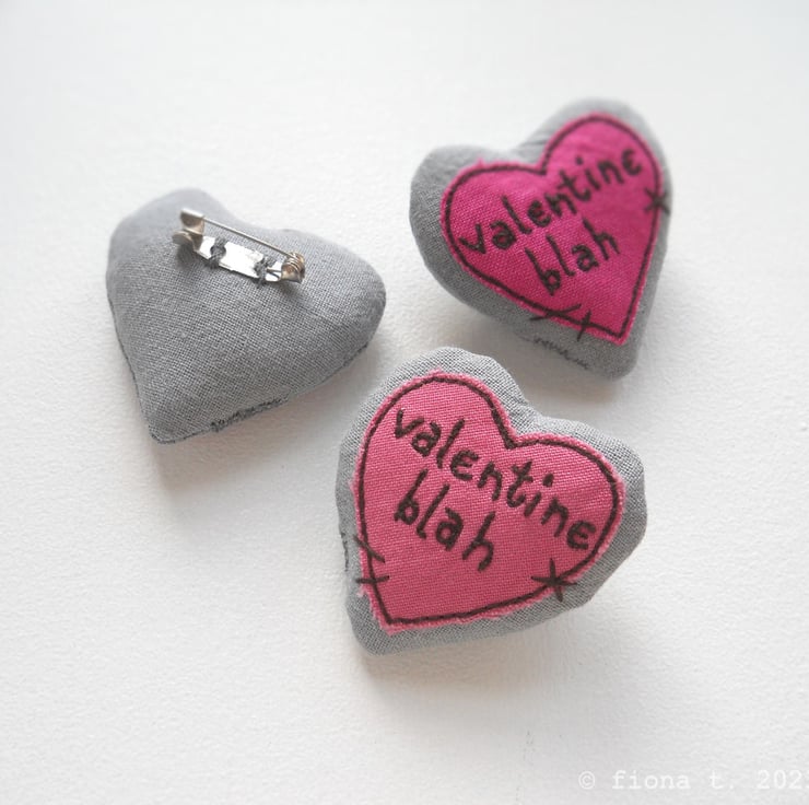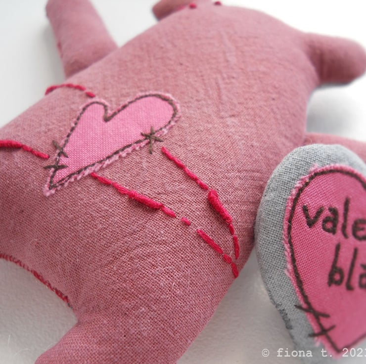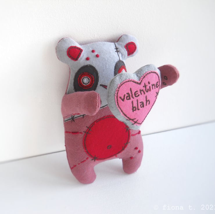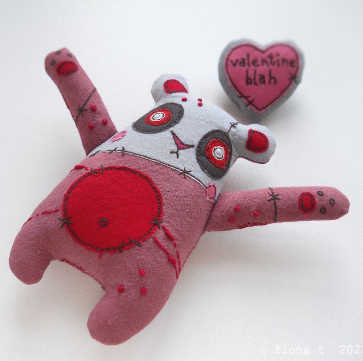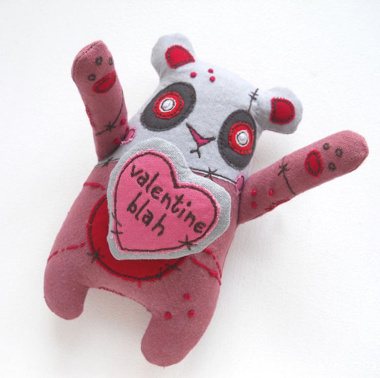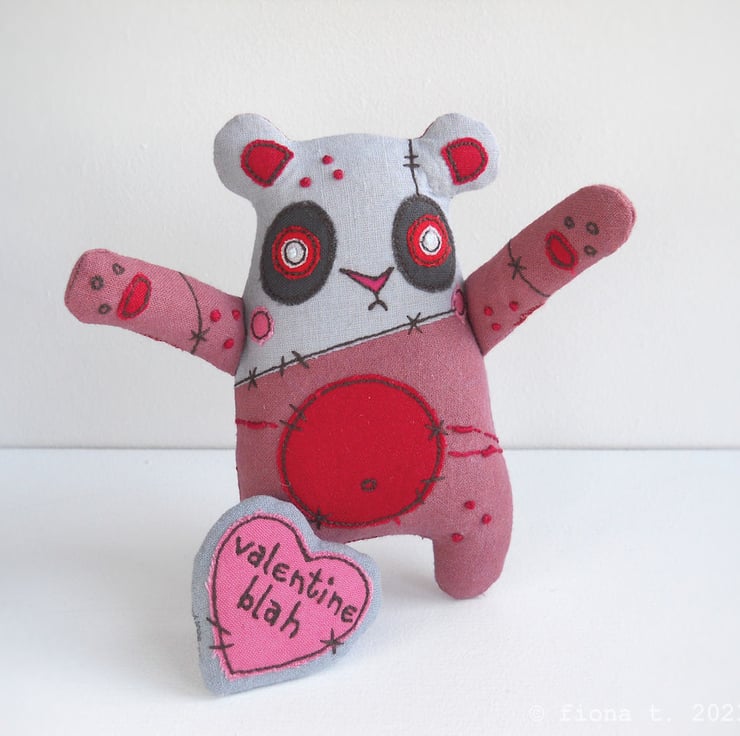 perfect for cynical romantics – hand dyed red zombie panda (she measures 12cm / 4.5 inches from the top of her ears to the tips of her lumpen toes. with her loving arms outstretched, she’s 15cm / 6 inches wide) presenting a stuffed heart brooch (5cm tall) with the text “valentine blah” freehand embroidered on it.