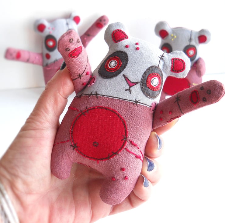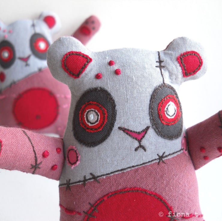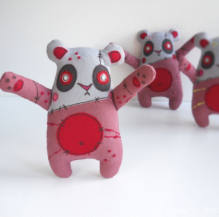 hand dyed, machine & hand embroidered valentine’s day zombie panda, with handmade textile brooch.
