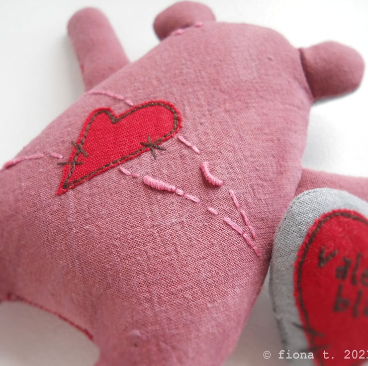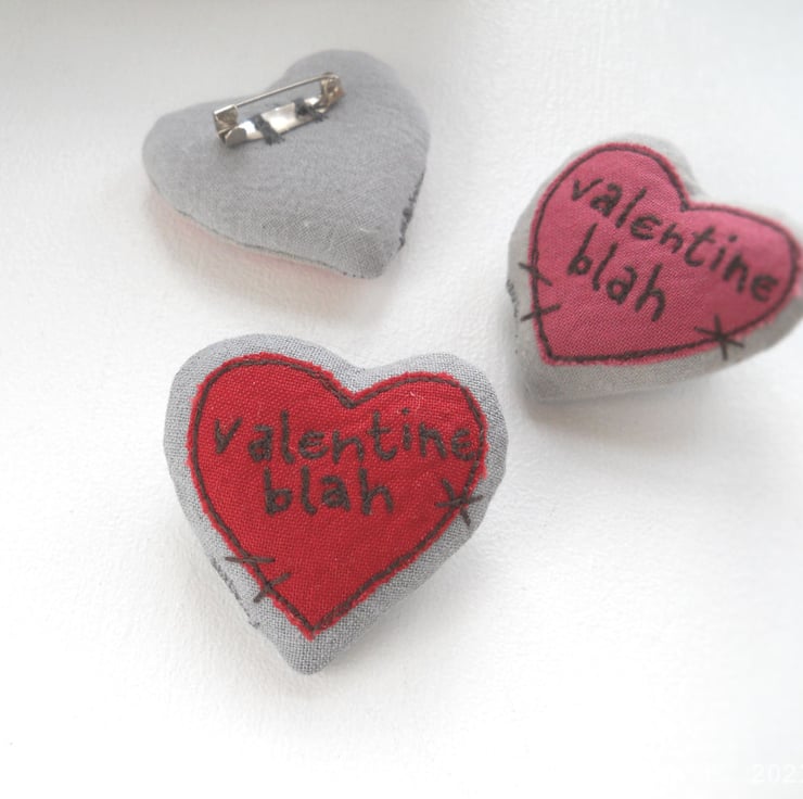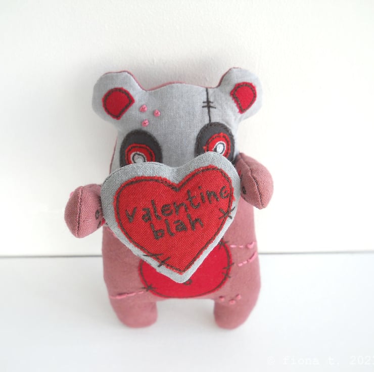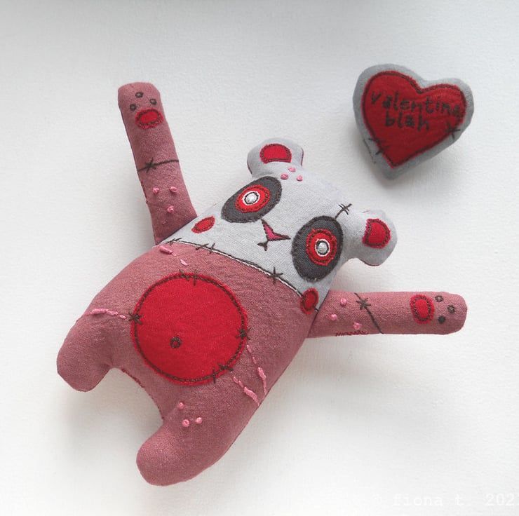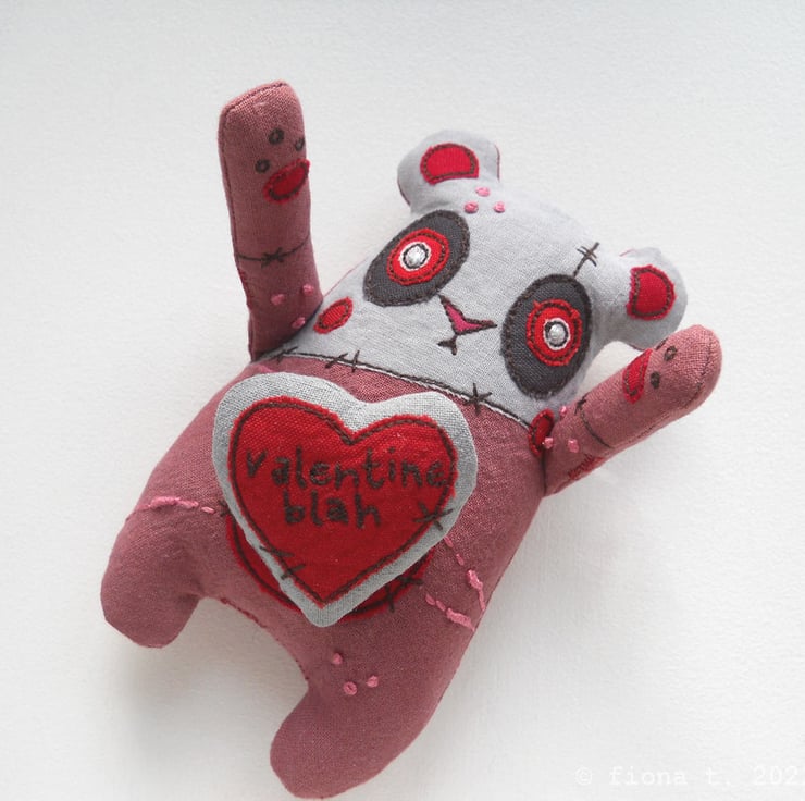 perfect for cynical romantics – hand dyed red zombie panda (she measures 12cm / 4.5 inches from the top of her ears to the tips of her lumpen toes. with her loving arms outstretched, she’s 15cm / 6 inches wide) presenting a stuffed heart brooch (5cm tall) with the text “valentine blah” freehand embroidered on it.