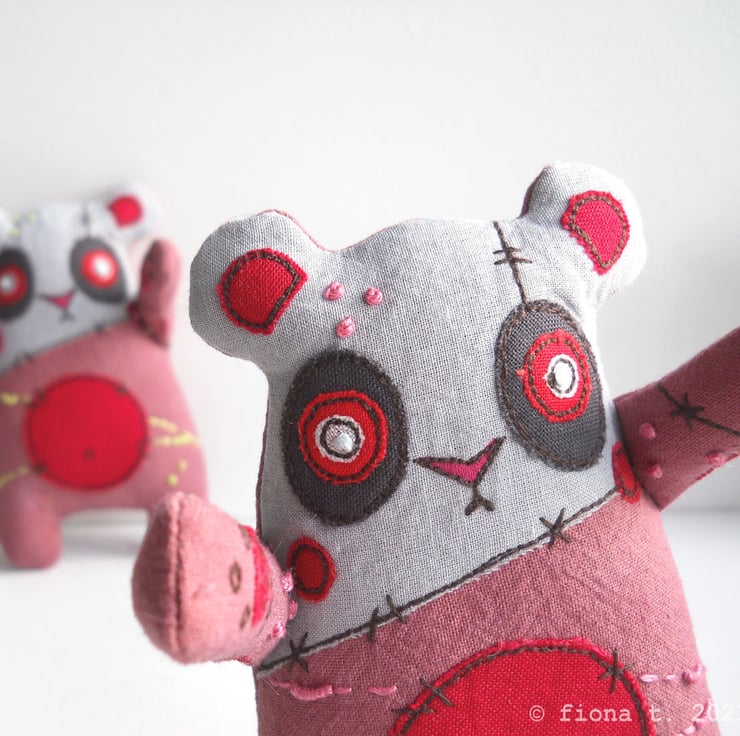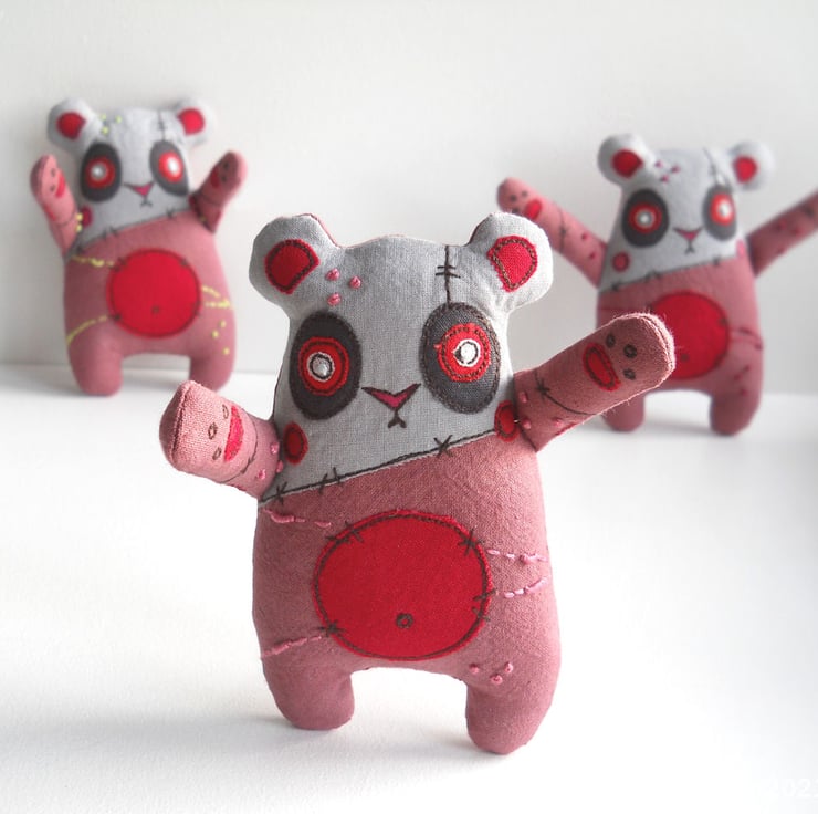 hand dyed, machine & hand embroidered valentine’s day zombie panda, with handmade textile brooch.