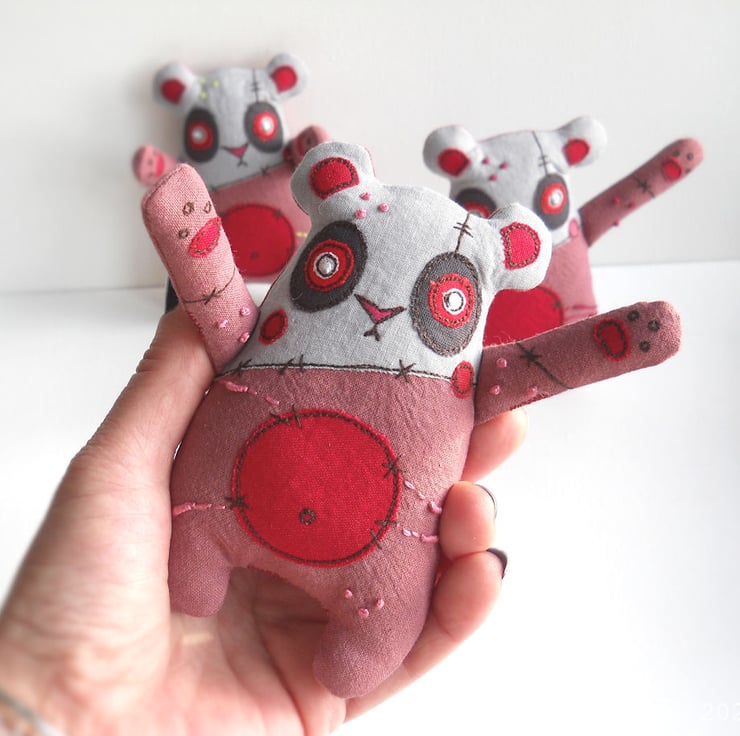 zombie panda is made from heavy weight calico. she’s stuffed with polyester filling (CE & BS5852) and finished by hand.