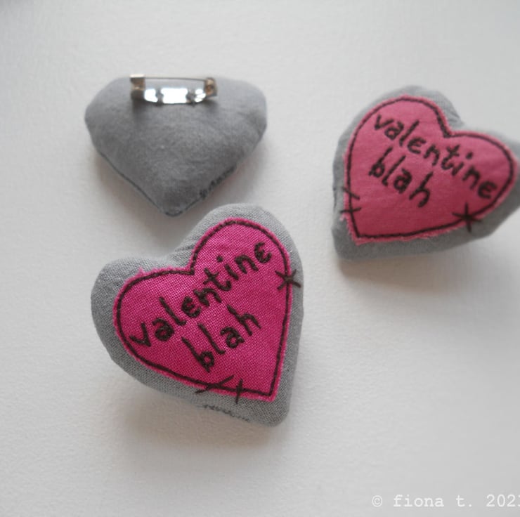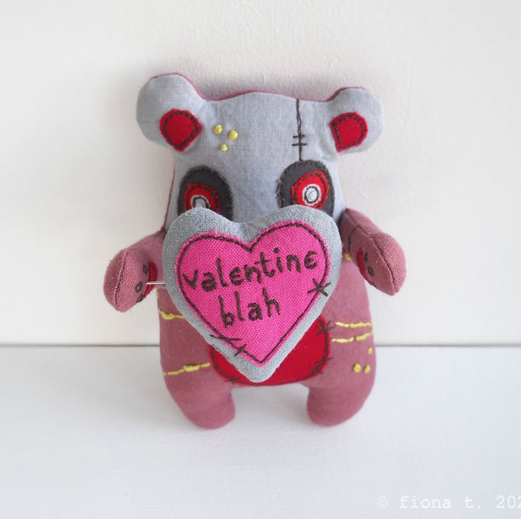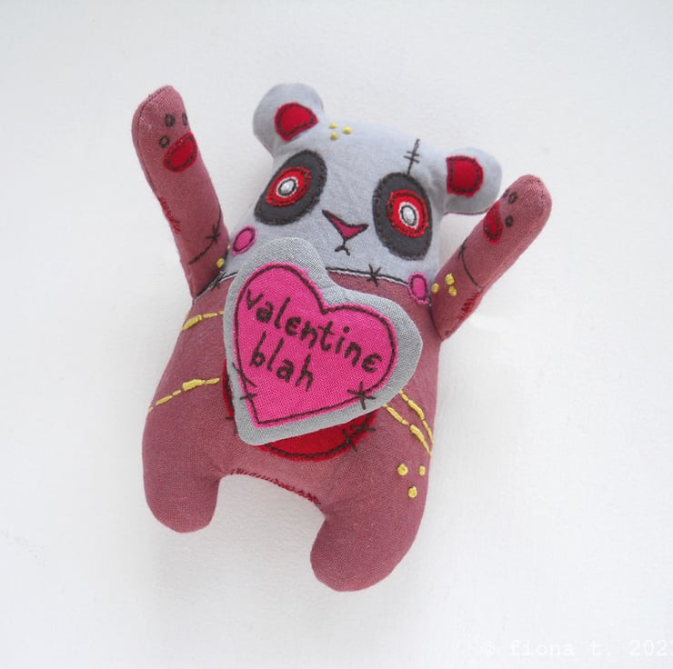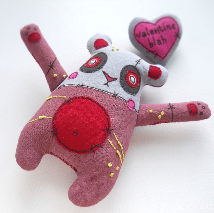 perfect for cynical romantics – hand dyed red zombie panda (she measures 12cm / 4.5 inches from the top of her ears to the tips of her lumpen toes. with her loving arms outstretched, she’s 15cm / 6 inches wide) presenting a stuffed heart brooch (5cm tall) with the text “valentine blah” freehand embroidered on it.