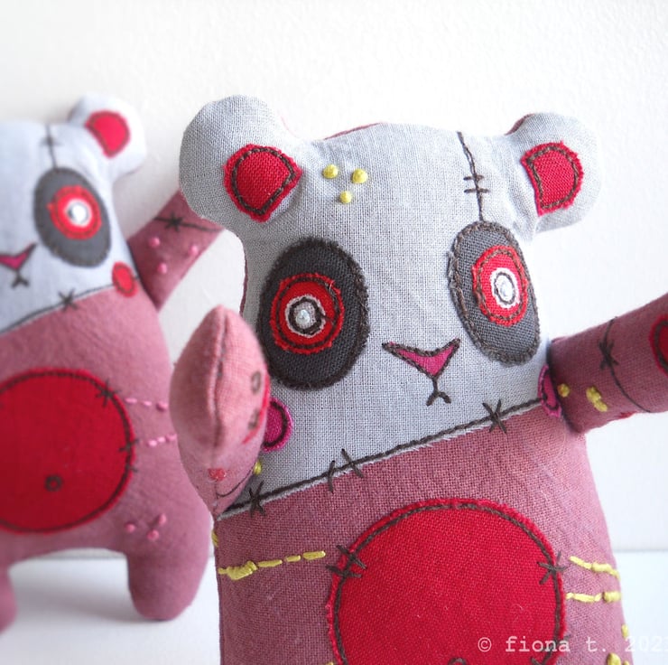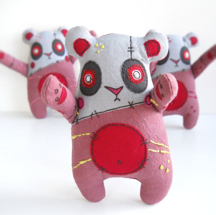 hand dyed, machine & hand embroidered valentine’s day zombie panda, with handmade textile brooch.