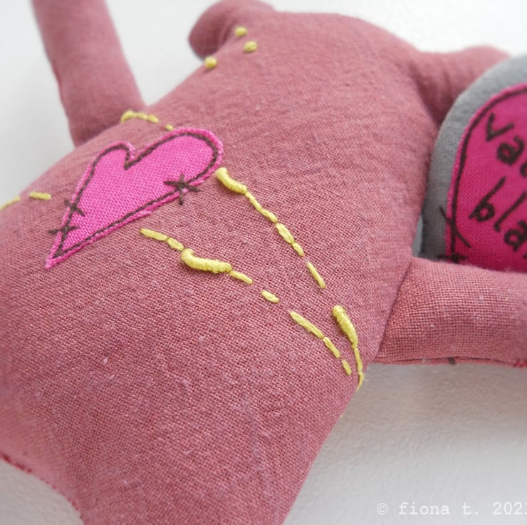cotton lawn and red cotton fabrics have been hand snipped & appliqued onto a base fabric of hand dyed cotton calico. cheeks, brooches & the embroidered heart on her bottom are in bright pink.