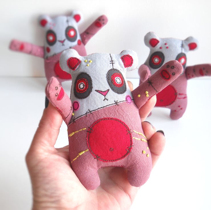 zombie panda is made from heavy weight calico. she’s stuffed with polyester filling (CE & BS5852) and finished by hand.