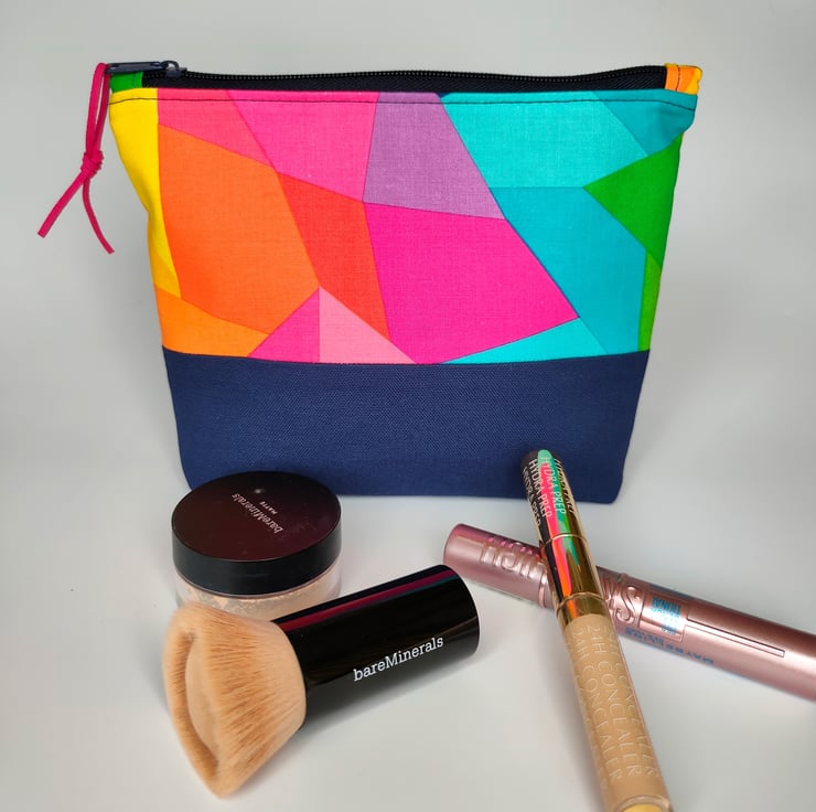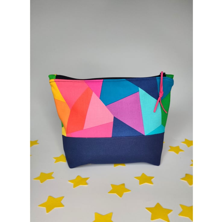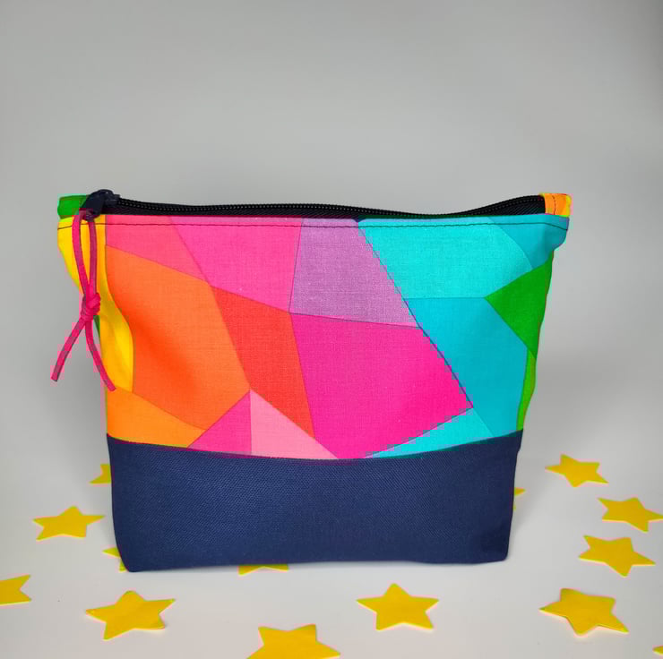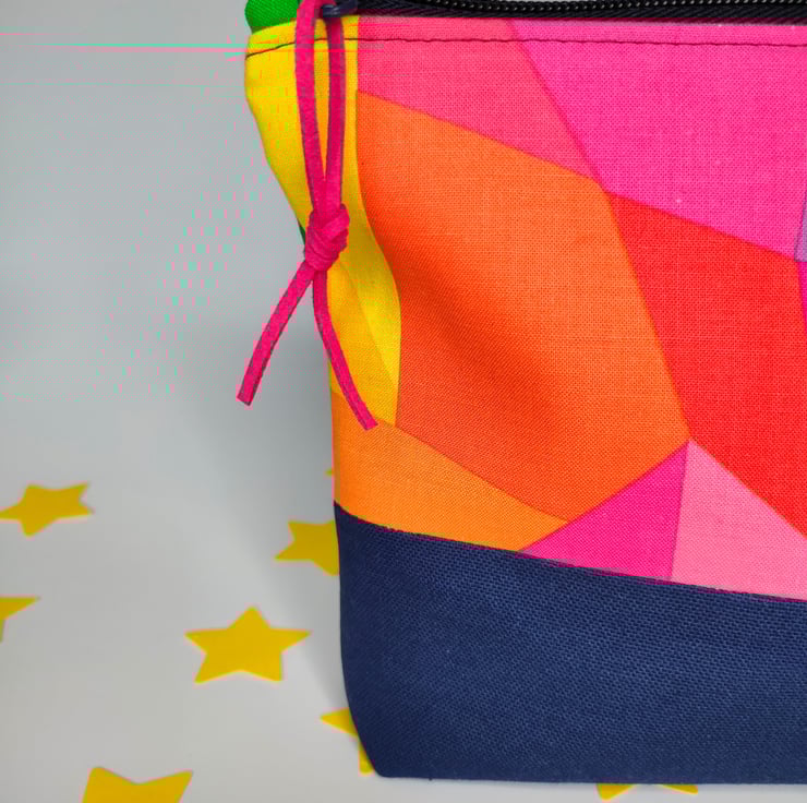 A gorgeous and fun zipper pouch with high quality rainbow patterned cotton above a navy canvas base. The fun continues inside the bag with a big colour pop of yellow cotton for the lining. Vegan suede is used for the zipper pull - in beautiful cerise pink.