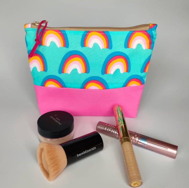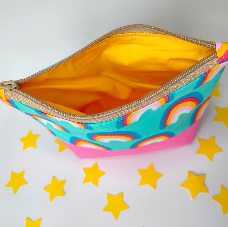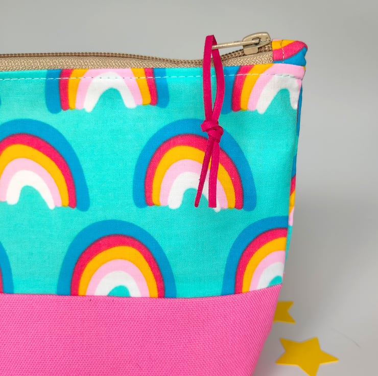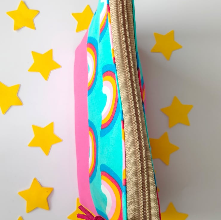 This cute make up bag/pencil case/zipper pouch will add a touch of fun to your day. Made using rainbow fabric matched with pink canvas, yellow cotton lining and vegan suede cerise zip pull.