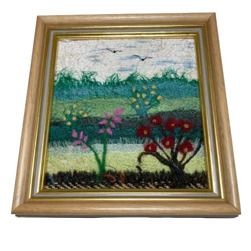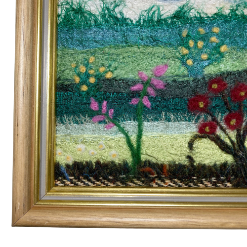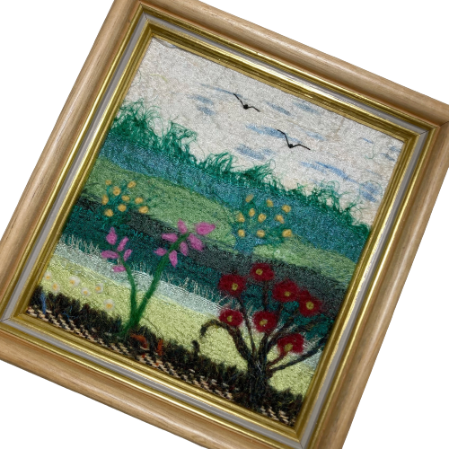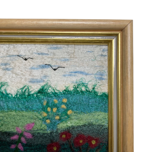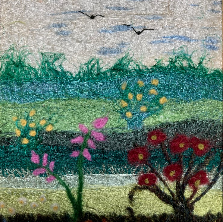 A textile art picture made using strips of silk fabric and woollen fibres. The background to this picture consists of strips of coloured silk fabric needle felted to a piece of backing felt. Various woollen fibres have also been added to provide additional texture and detail. The flowers have been added to the foreground using woollen fibres needle felted into place. The needle felting process binds the fabric and fibres together and creates a wonderful texture to the work without the need for any sewing.