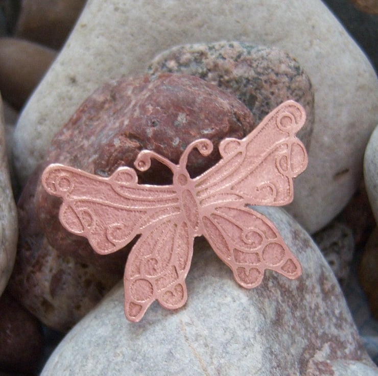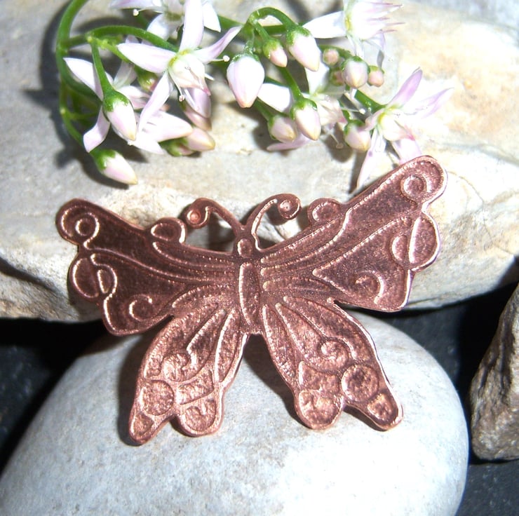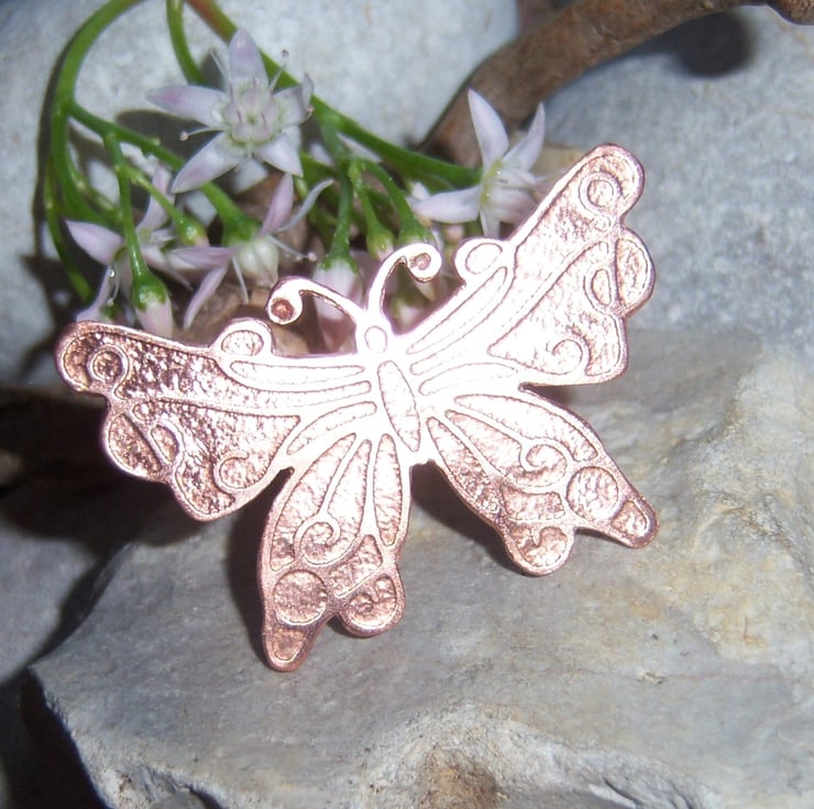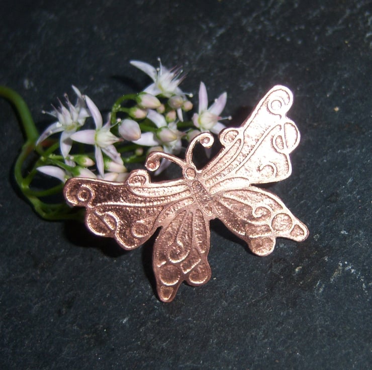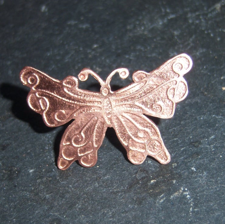 A butterfly etched and cut from copper sheet. Approximately 5cms x 3cms. Finished with a sterling silver brooch fastener.