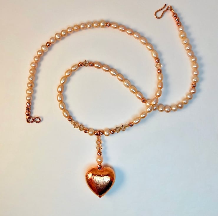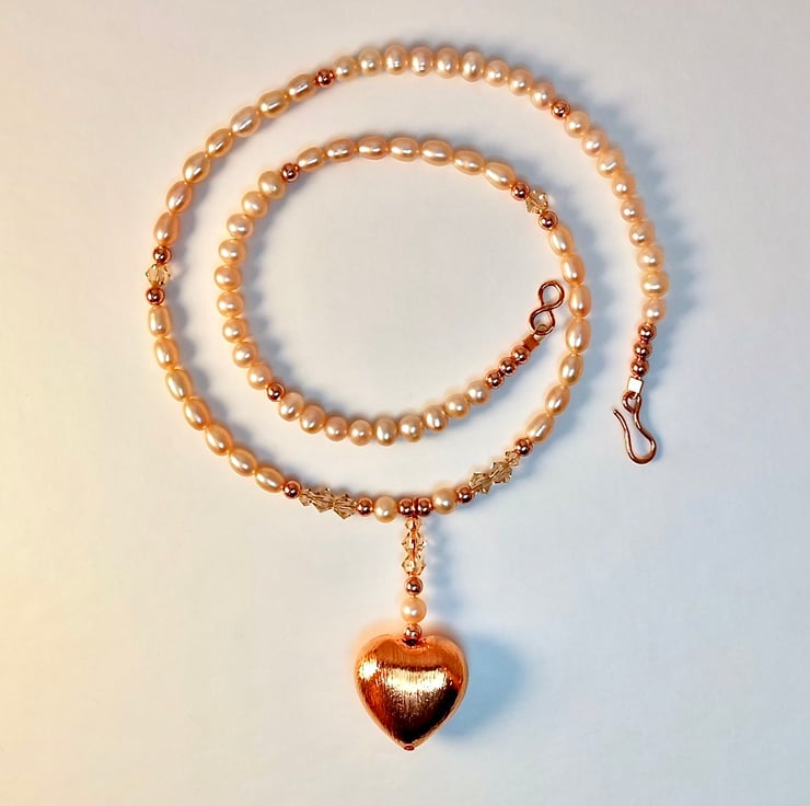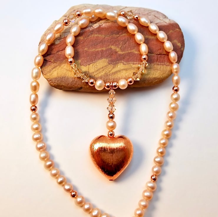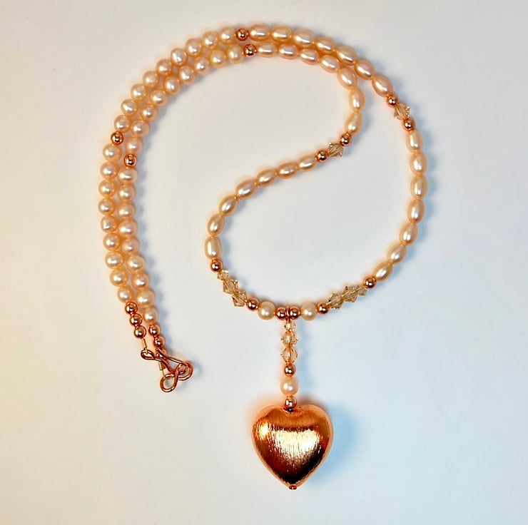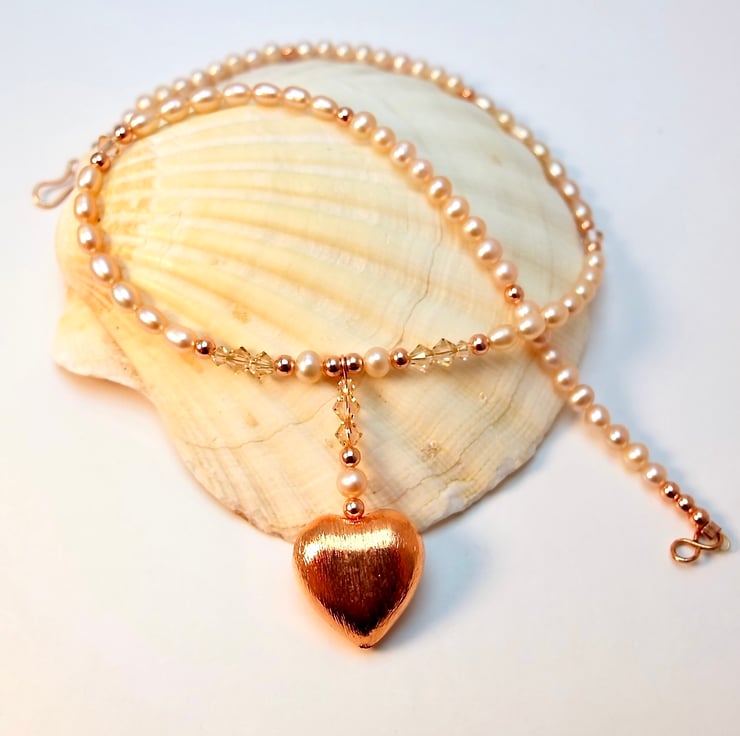 As a centrepiece I have made a pendant using a 20mm copper heart that has a brushed-effect finish, a single potato pearl set between 3mm copper rounds, topped with a trio of Swarovski crystals - two 4mm bicones and a 3mm bicone - in the colour 'light peach'.