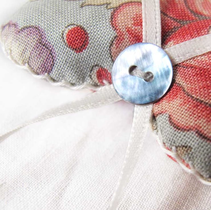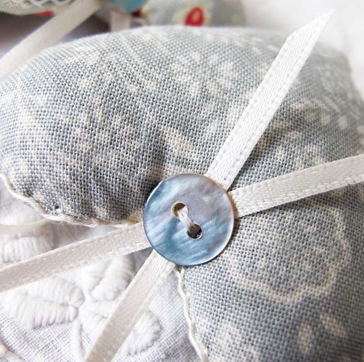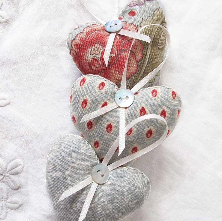 A very pretty little set of three lavender bags - hand made, filled with beautiful scented lavender and then finished with hand embroidery, co-ordinating ribbon and shell buttons. The hearts measure 6cm wide x 6.5cm long (not including the ribbon) and are in co-ordinating pale blue, cream and red fabric.