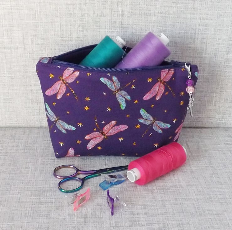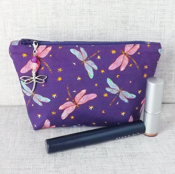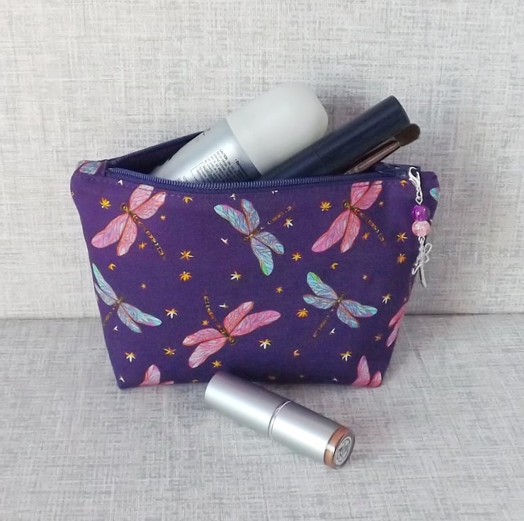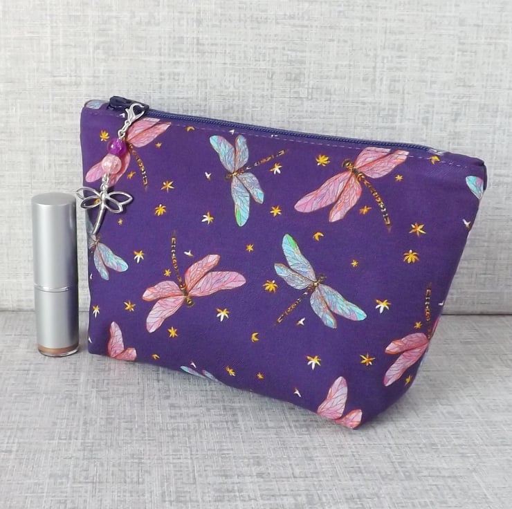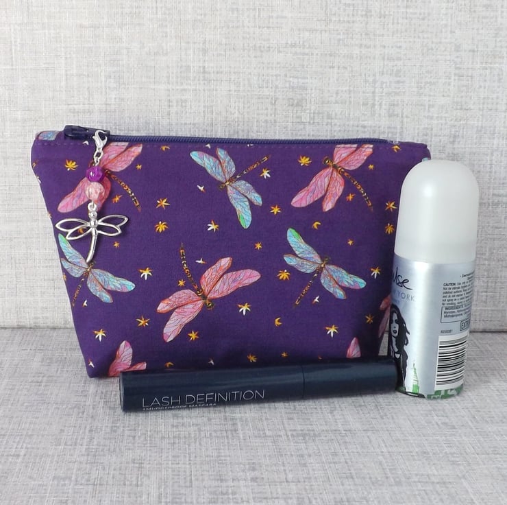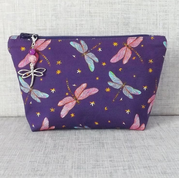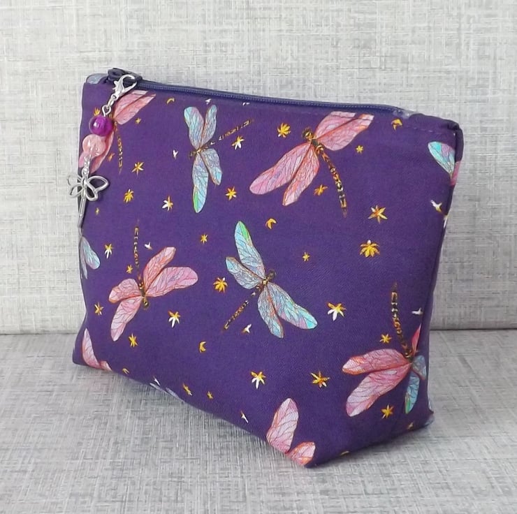 A medium sized make up bag made from a cotton fabric with a dragonfly design.