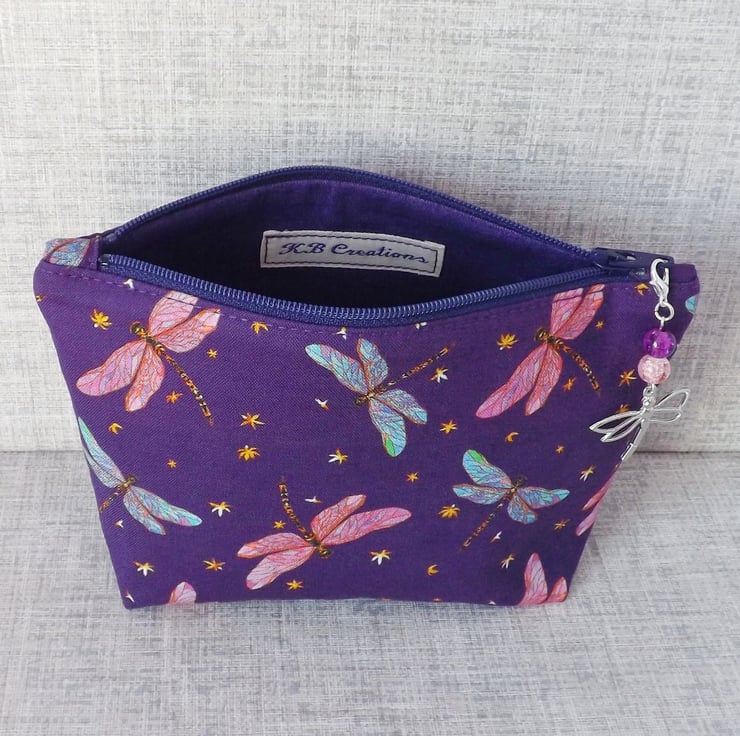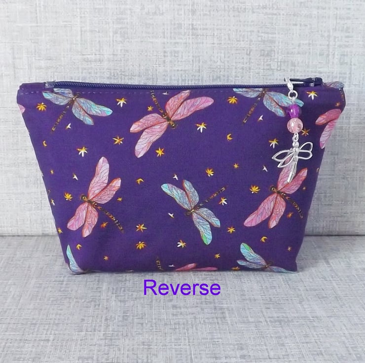 The fabric has been backed with fusible interfacing to give body to the bag, and there is a zip closure on the top with a dragonfly & bead charm on the zipper pull.