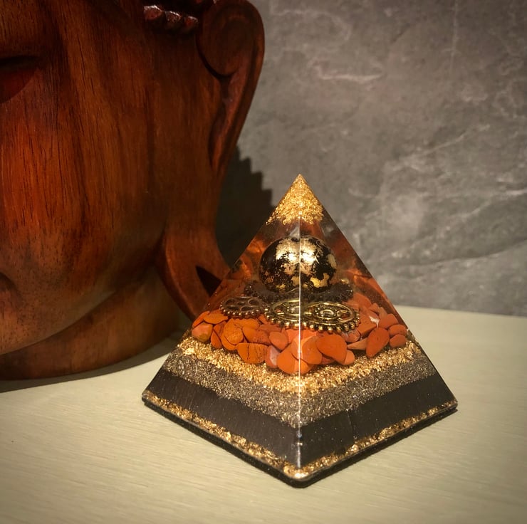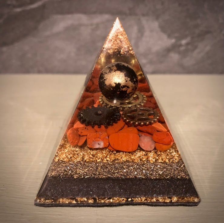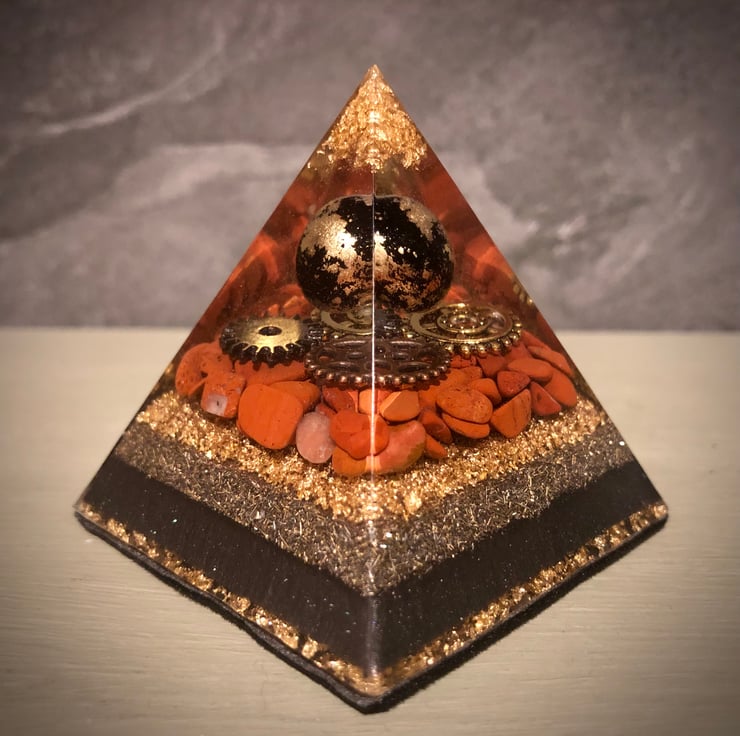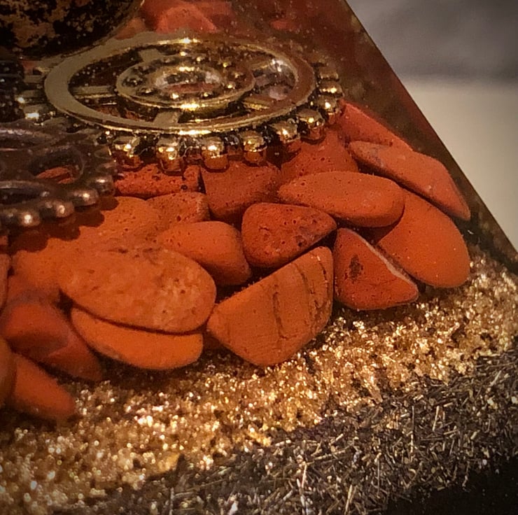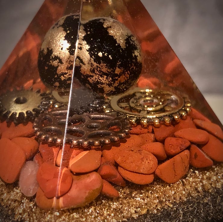 Well, I have to say this is just an amazing piece with amazing energies (properties in the "inspiration" section below)! The beautiful rich brick red colour tones of the Red Jasper gemstones cushioning a gold, bronze and dark chrome coloured cogs with the floating sphere hovering above, really draws you in. Gold leaf, metal shavings and black mica powders have also been incorporated in the design giving a rich majestic vibe.