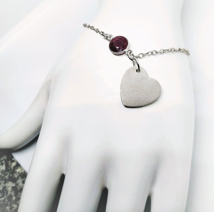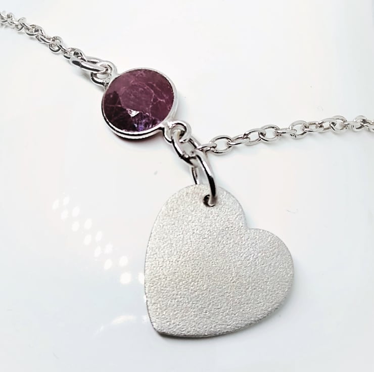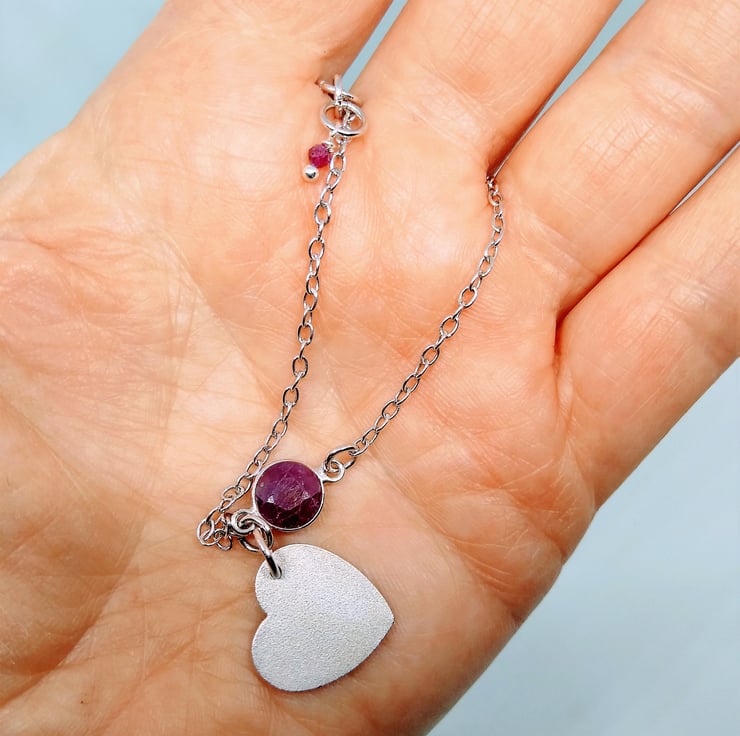 This easy to wear 925 sterling silver rolo chain bracelet is linked together with an 8mm bezel set natural faceted 2.35ct Ruby from India and finished with a matt textured 15mm heart charm. The bracelet can be worn at 7 -8 inch and the 1 inch extender 6mm links are finished with a 2mm round faceted Ruby and lobster claw clasp.