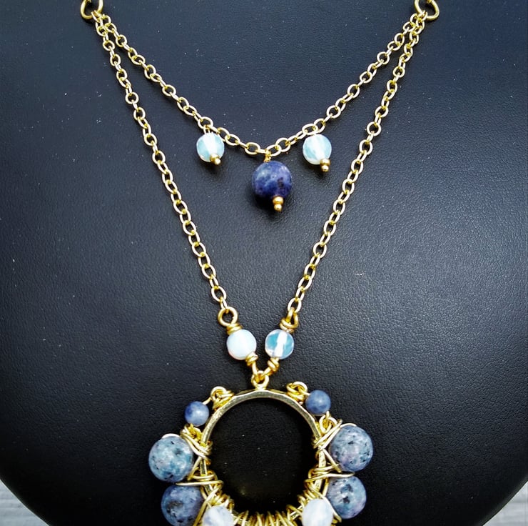 Denim Blue Jasper & White Opalite Two Layer Gold Plated Necklace 24 Inch