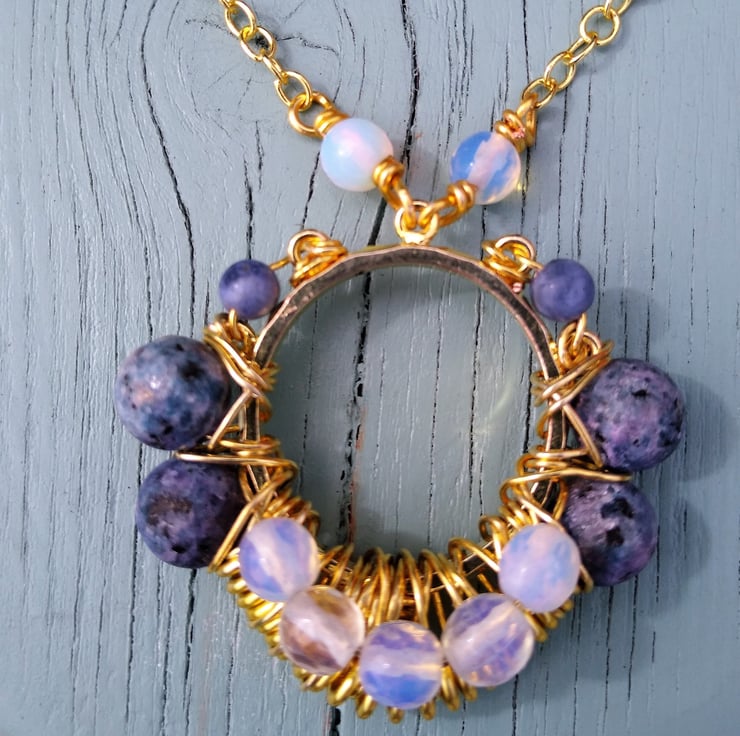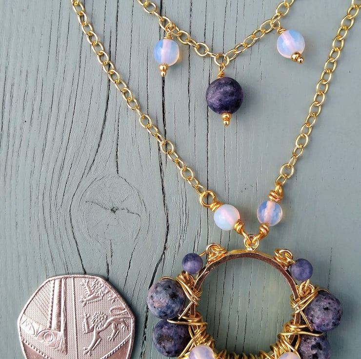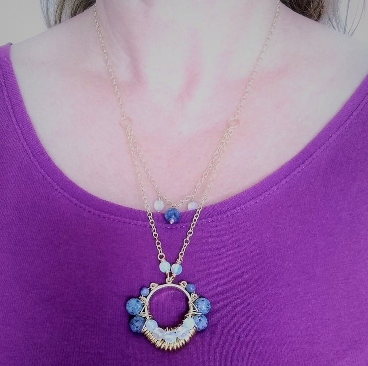 24" Gold Plated double layered chain necklace with frosted Matte denim Blue coloured Jasper (8mm rounds) and white Opalite faceted 6mm beads pendant, finished with a gold plated lobster claw clasp. This will look amazing worn casually in the day or dressed up for the evening. If you would like some drop earrings to match this necklace please put the following link in your search bar to see them . To make a third layer for this necklace take a look at the 18" necklace which will match beautifully with this and was made with this idea in mind -