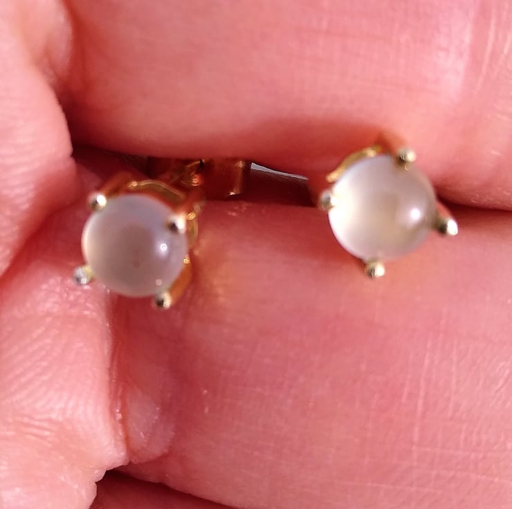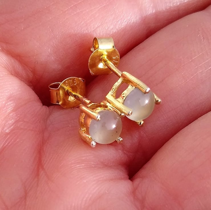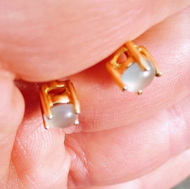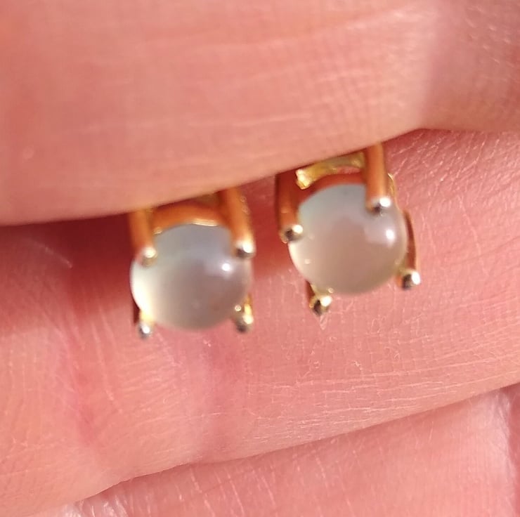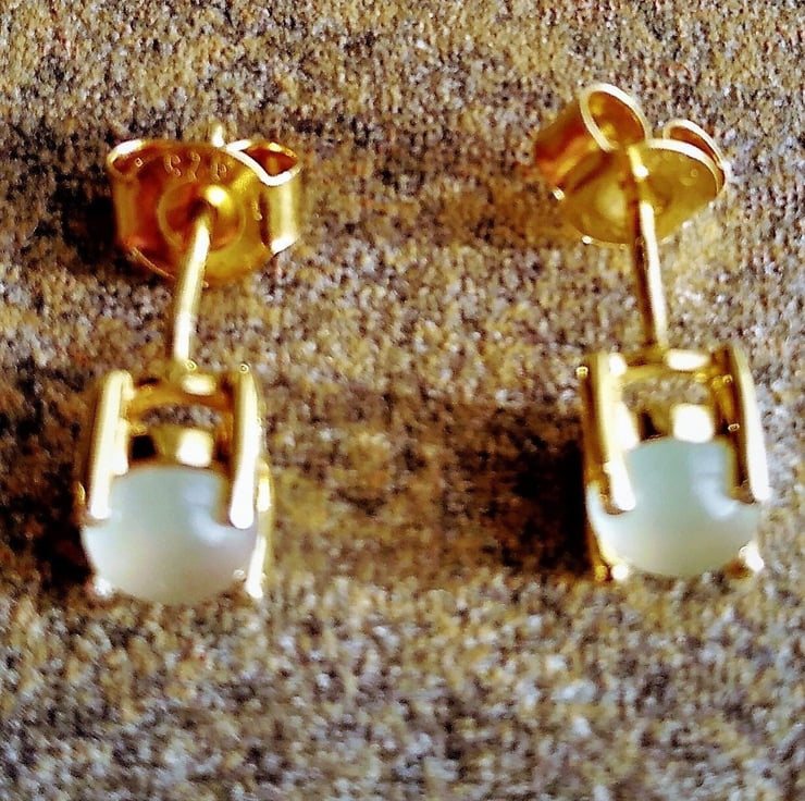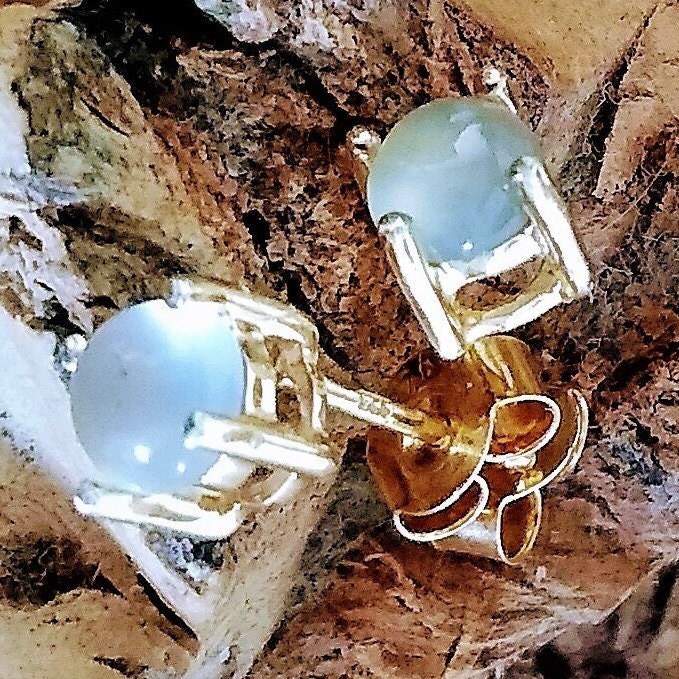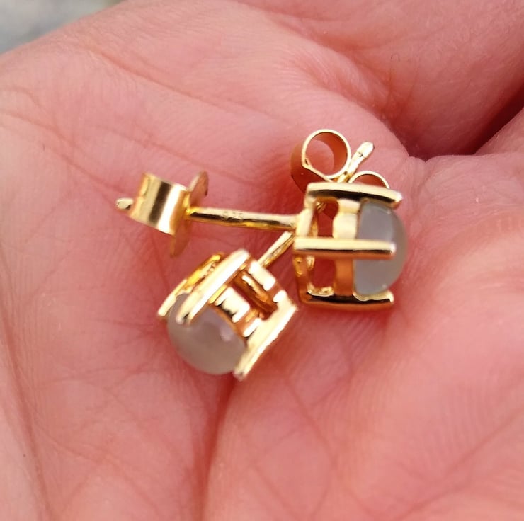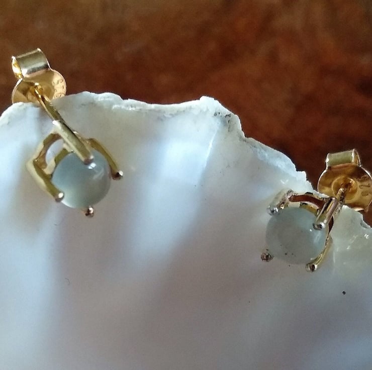 Would you like to own one of the newly found African gemstones only discovered in 2013 by Yianni Melas. These amazing certified 5mm Aquaprase cabochons are set into 9ct gold plated Sterling Silver ear studs. Each gemstone is natural and cut into a polished cabochon giving approx 0.4ct per gemstone. This new gemstone is a highlight of big designer Jewellery collections such as Boucheron and Le Vian and not readily available on the high street.