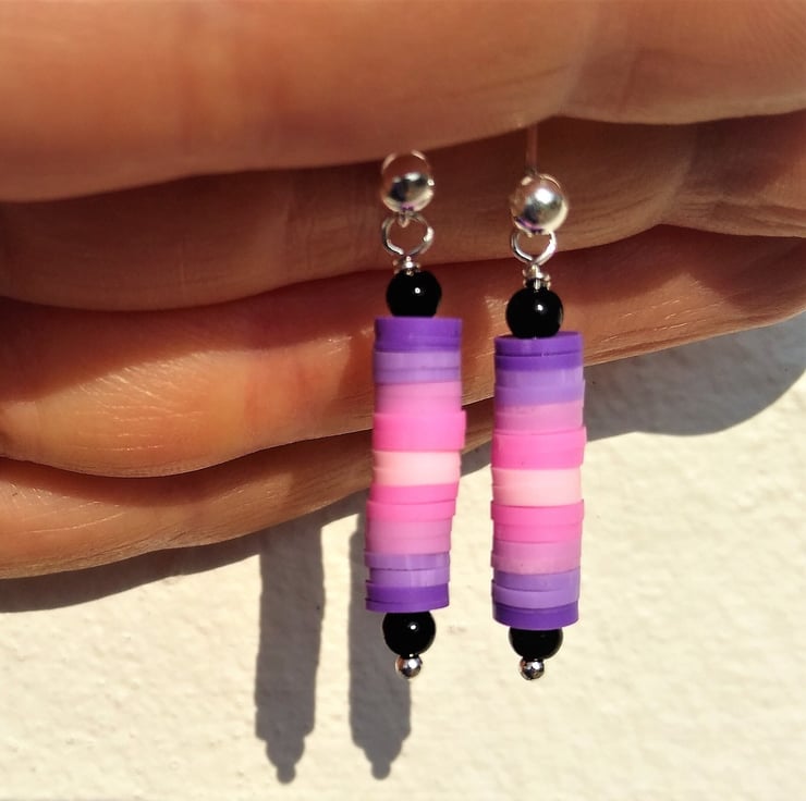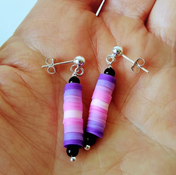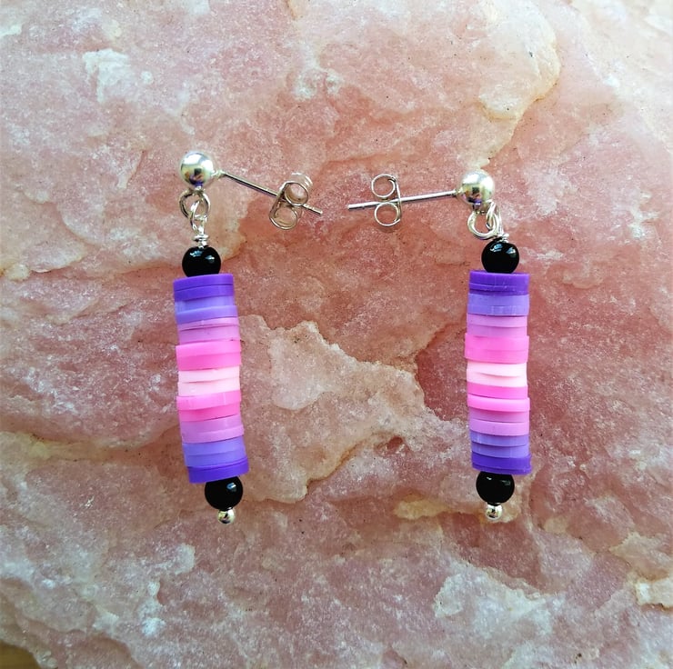 A colourful, light weight and easy to wear pair of sterling silver studs. Made with 3mm smooth black glass beads and ombree shades of pink to purple vinyl heshi beads. A beautiful pop of colour to suit any outfit from formal occasions to a day on the beach. Ideal for any age 10 -100 years. Length of earring 40mm approx.