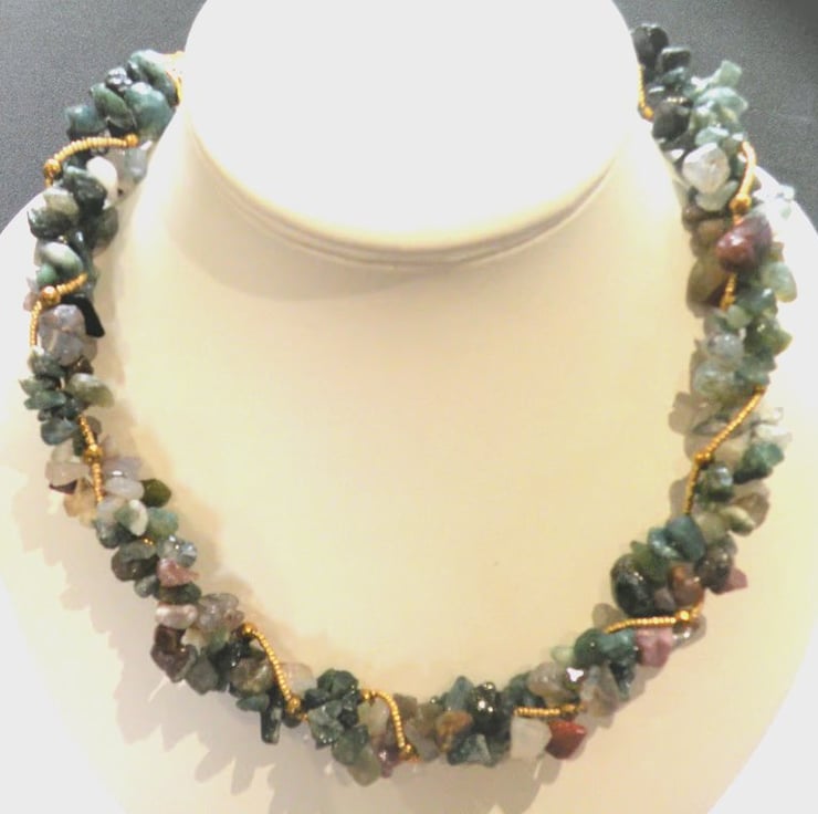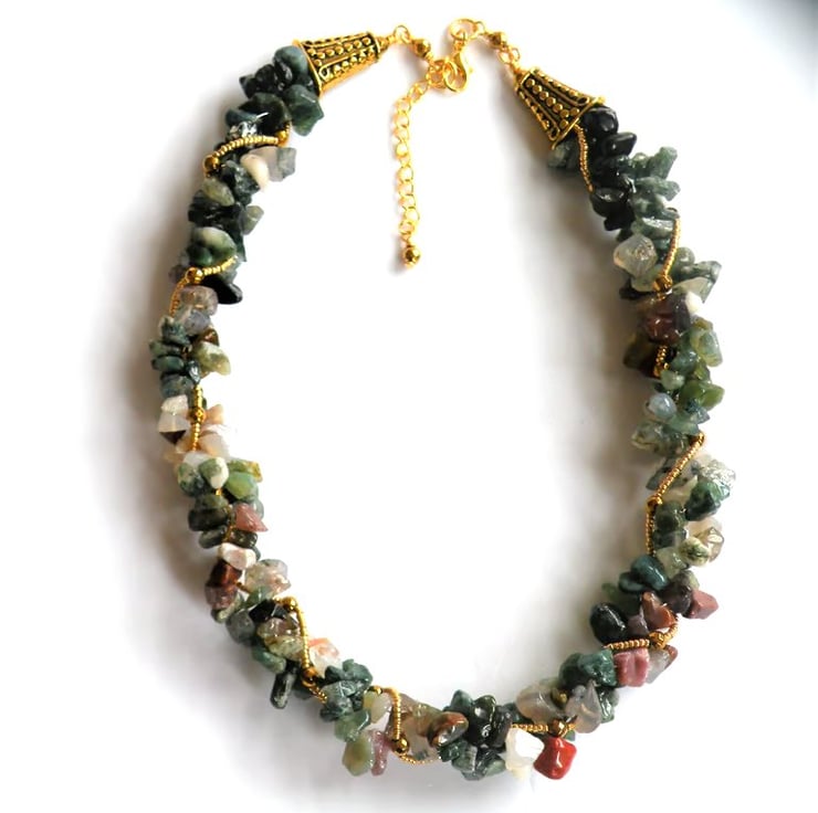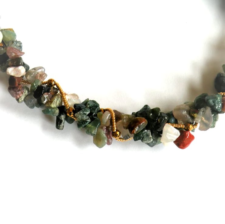 Bring colour, calm and natural earthy beauty to your jewellery collection with this handcrafted Fancy Jasper twisted rope necklace. Rich shades of green, terracotta, rose and soft white blend together in a stunning mix of natural gemstone tones. Each Fancy Jasper nugget is complemented by a strand of golden Hematite and delicate glass seed beads, adding a subtle shimmer and a touch of sophistication.