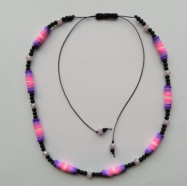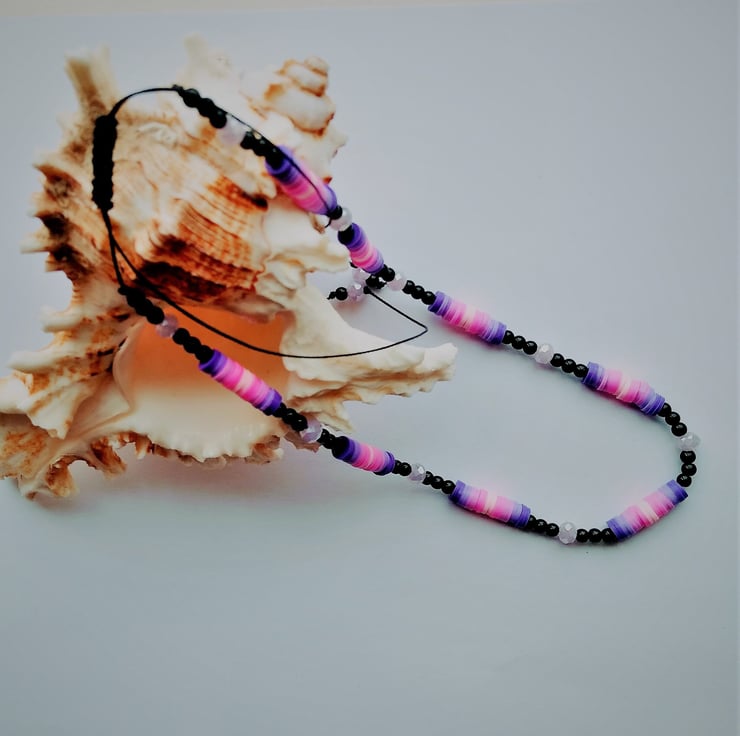 A colourful, light weight and easy to wear necklace for all ages. Made with 3mm smooth black glass beads and 6mm faceted lilac crystal beads and ombree shades of pink to purple vinyl heshi beads. Hand strung on to black waxed cord and finished with an easy to use sliding knotted clasp. This necklace has been designed to fit over the head at maximum 26 inch but can then be adjusted easily by gently pulling the two end cords down to 16 inch or anywhere in between so you can wear at your preferred length.