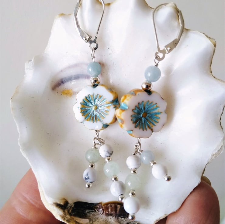 A beautiful summery pair of 925 Sterling Silver, turquoise blue and white drop earrings. Made using 4mm Aquamarine and white Howlite round gems which dangle from a Czech glass Hawaiian style flower. The flowers are each white with turquoise blue table cut sunburst centres. The earrings are finished with 925 Sterling Silver leverback ear fittings making them very secure in the ear and not easily pulled out by long hair or putting clothing on and off etc. Total length drop of 2.5 inch or 6cm approx