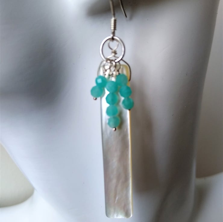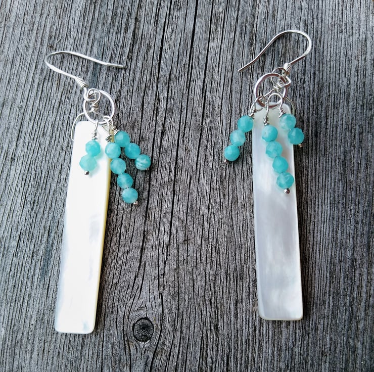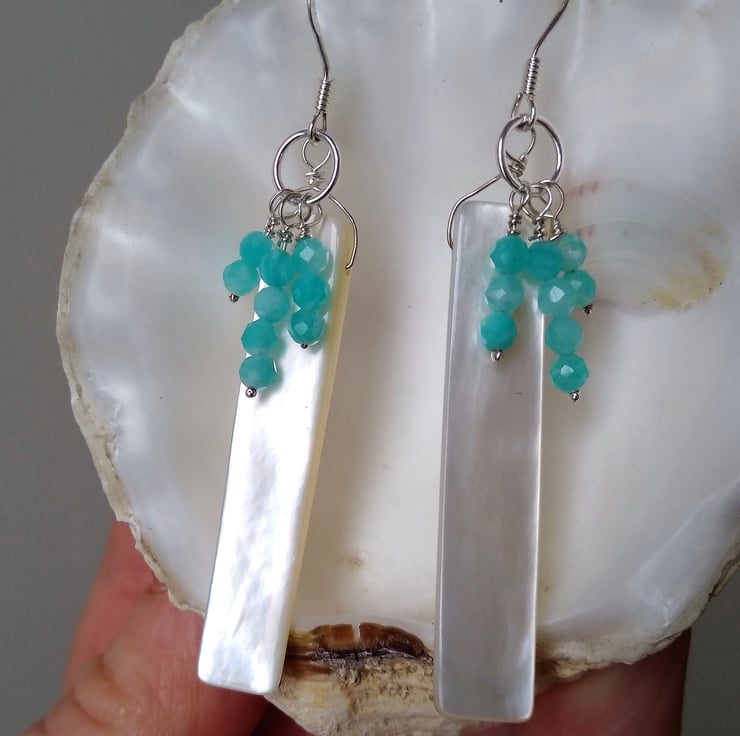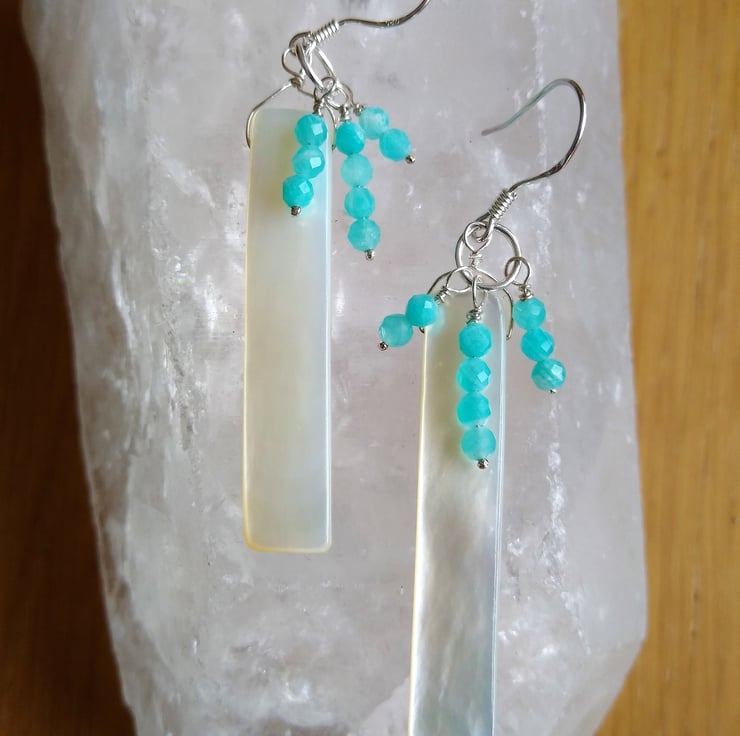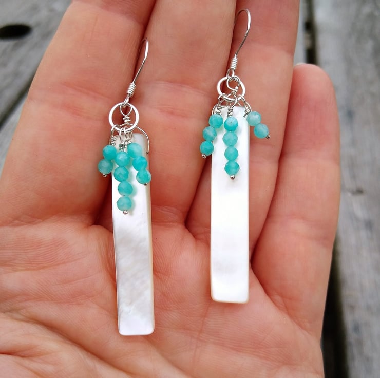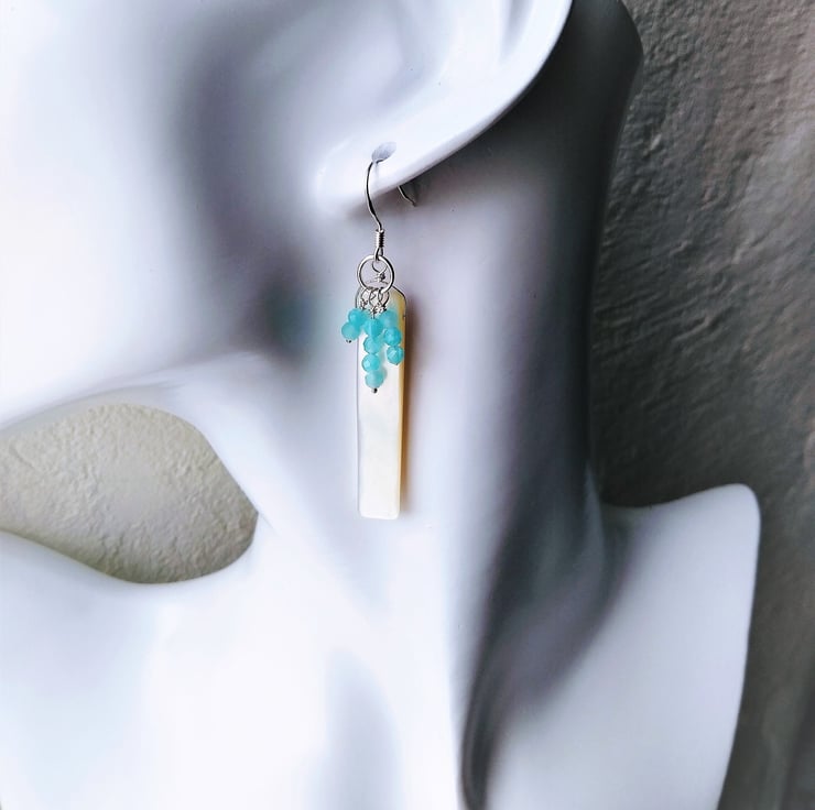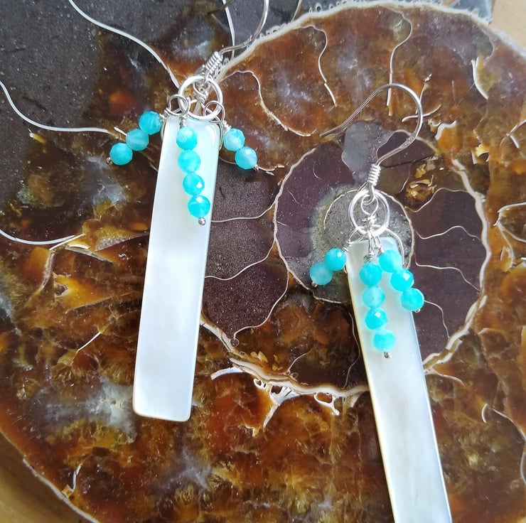 A beautiful mother of pearl shell bar, displaying all the colours of the rainbow as they twist in your ear. Highlighted by the tropical blue sea colour of the Peruvian Amazonite which sway gentle over the shell bar. The earrings hang 6cm or 2.25 inch approx from the ear