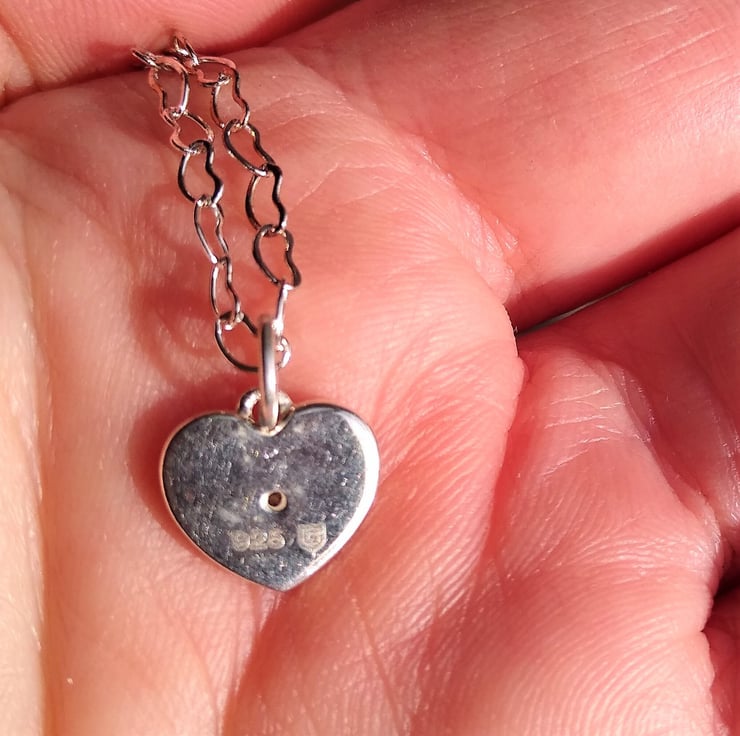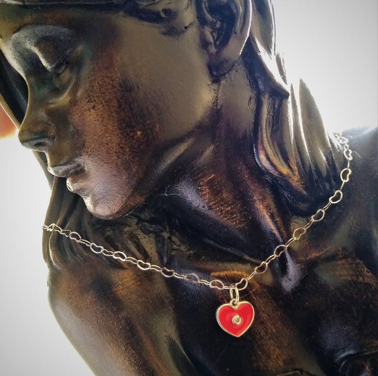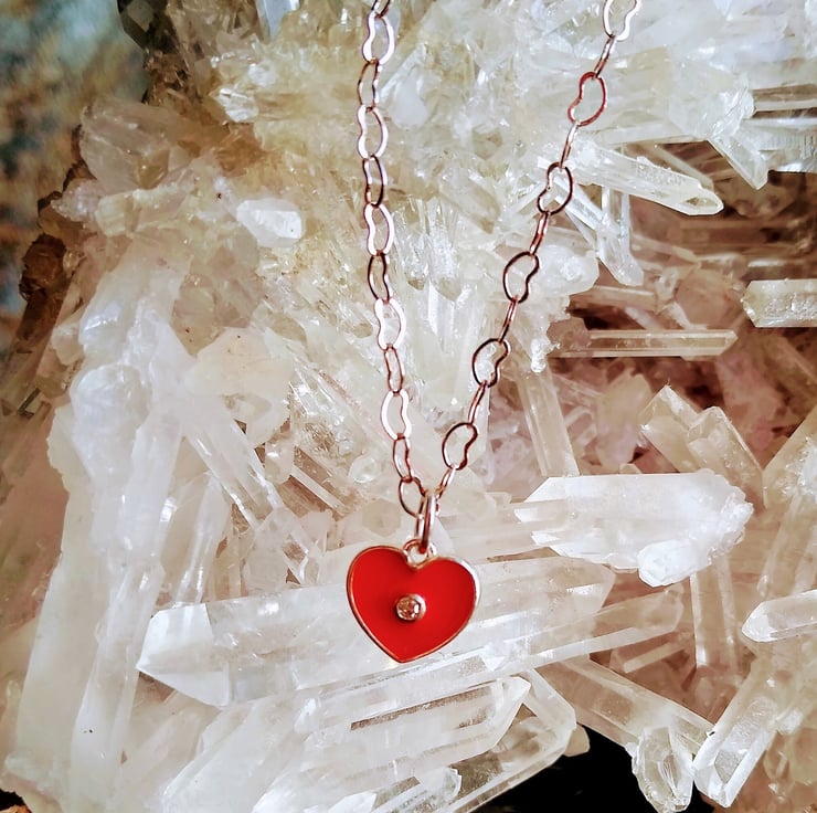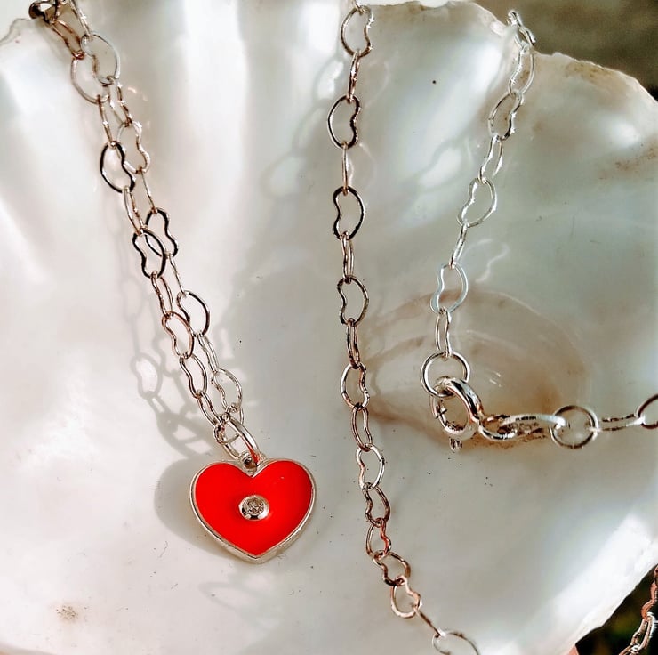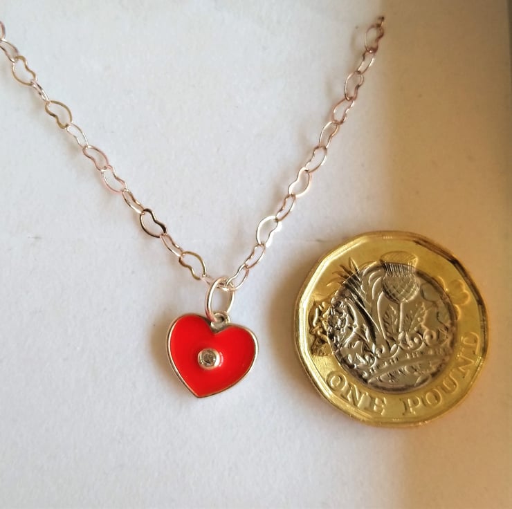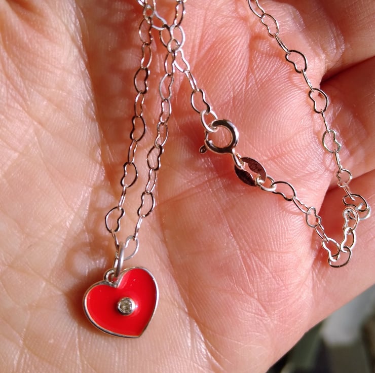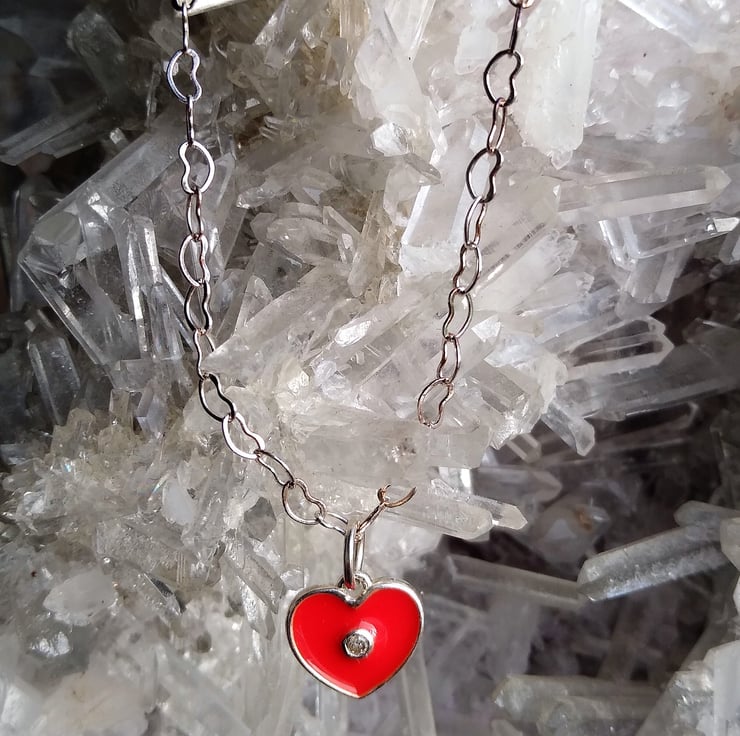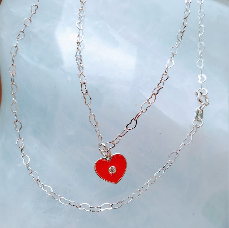 Show your someone special what they mean to you with this beautiful sterling silver and 10mm red enamelled heart pendant with a natural 1.5 x1.5 mm Diamond (0.02cts) in the centre. To add a special touch an unusual 2mm heart shaped link sterling silver chain has been used to suspend the pendant from. This necklace will come in a gift box with an authenticity certificate for the diamond.