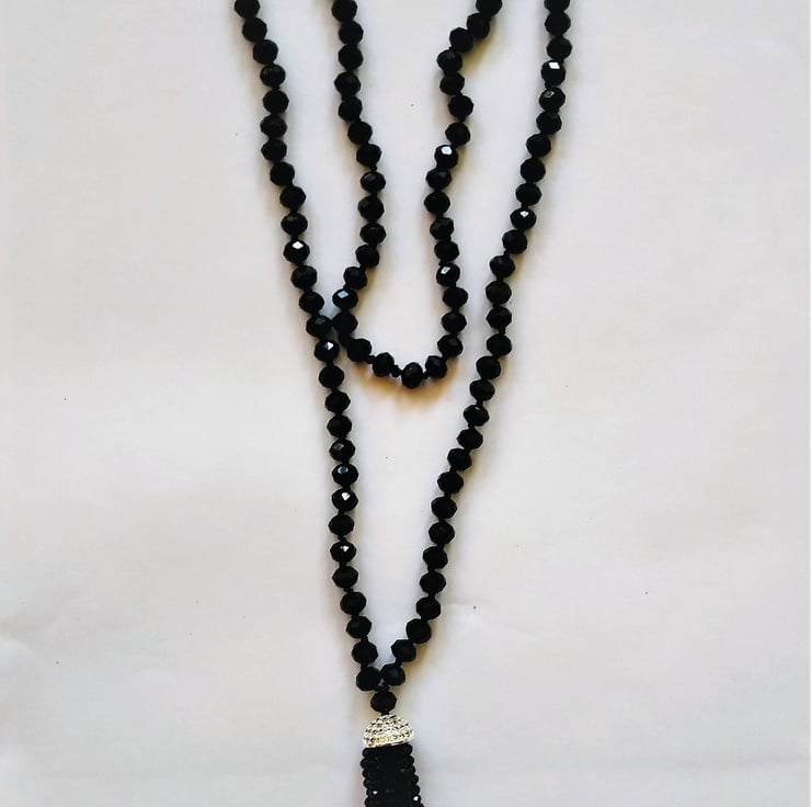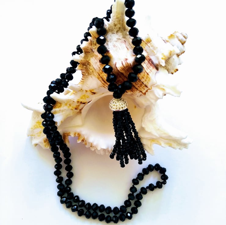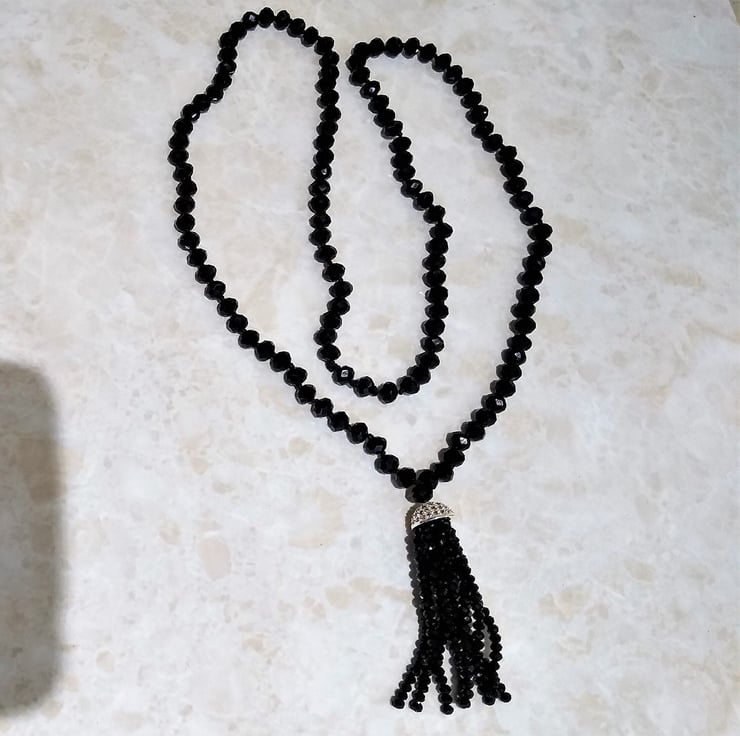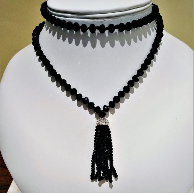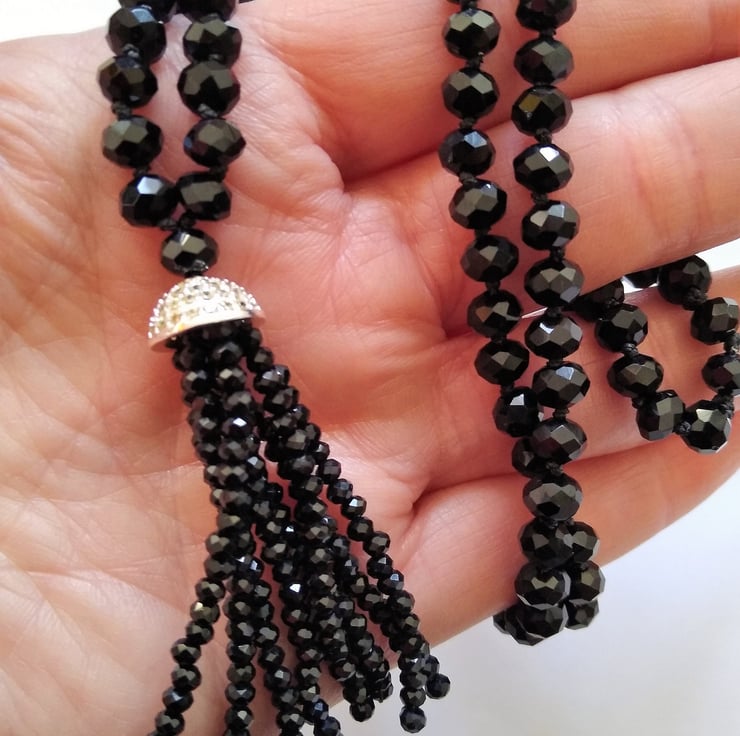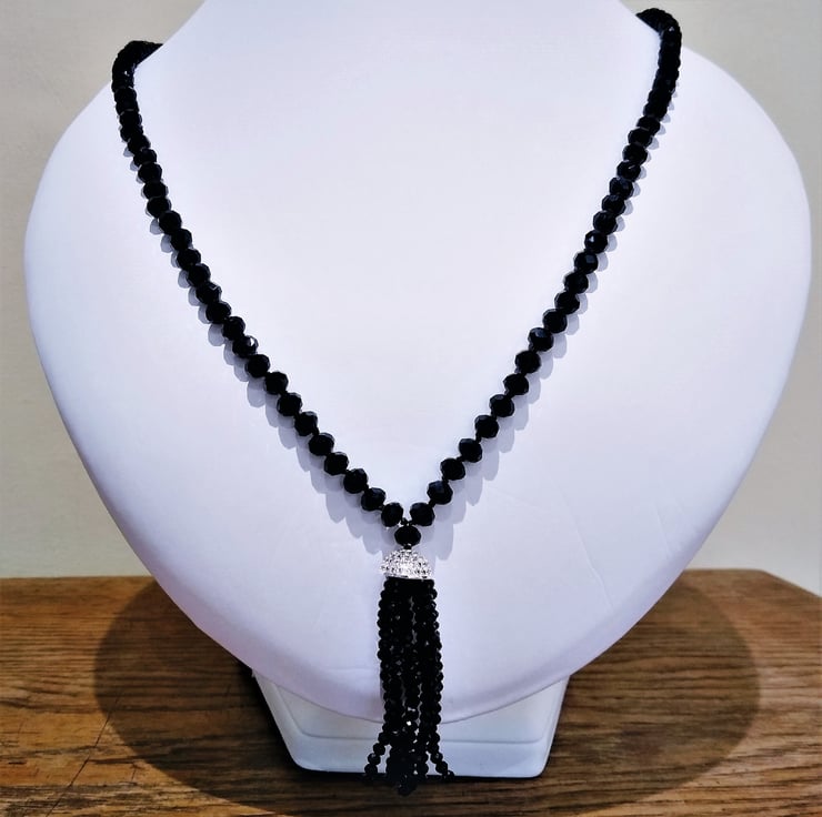 This ultimate eye catching necklace sparkles as it constantly moves and catches the light. Black Crystals are all hand knotted into a 28 inch (71 cm) approx overhead necklace with silver tone and cubic zirconia tassel cap and black crystal tassel. A wonderful necklace for day wear or to sparkle under the lights in the evening or special occasion. Easy to wear as it has no clasp and will look amazing worn with any colour outfit.