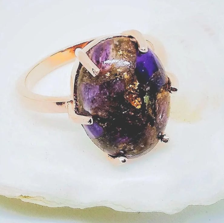 Mohave/ mojave stones are quite extraordinary, crafted through a hydraulic press process that combines pieces of genuine Amethyst and (in this case) a copper metal matrix to form this composite gem, so no two pieces will ever be the same. So a truly individual ring, perfect as a February birthstone gift, or Valentines gift